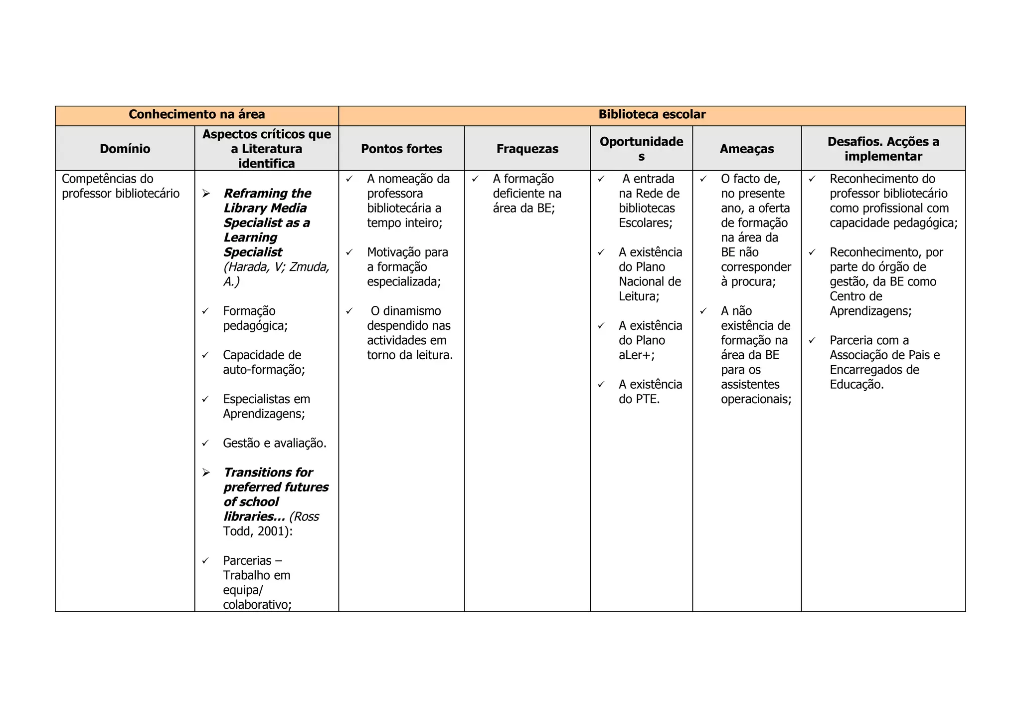 1) O documento identifica pontos fortes e fraquezas da biblioteca escolar, bem como oportunidades e ameaças;