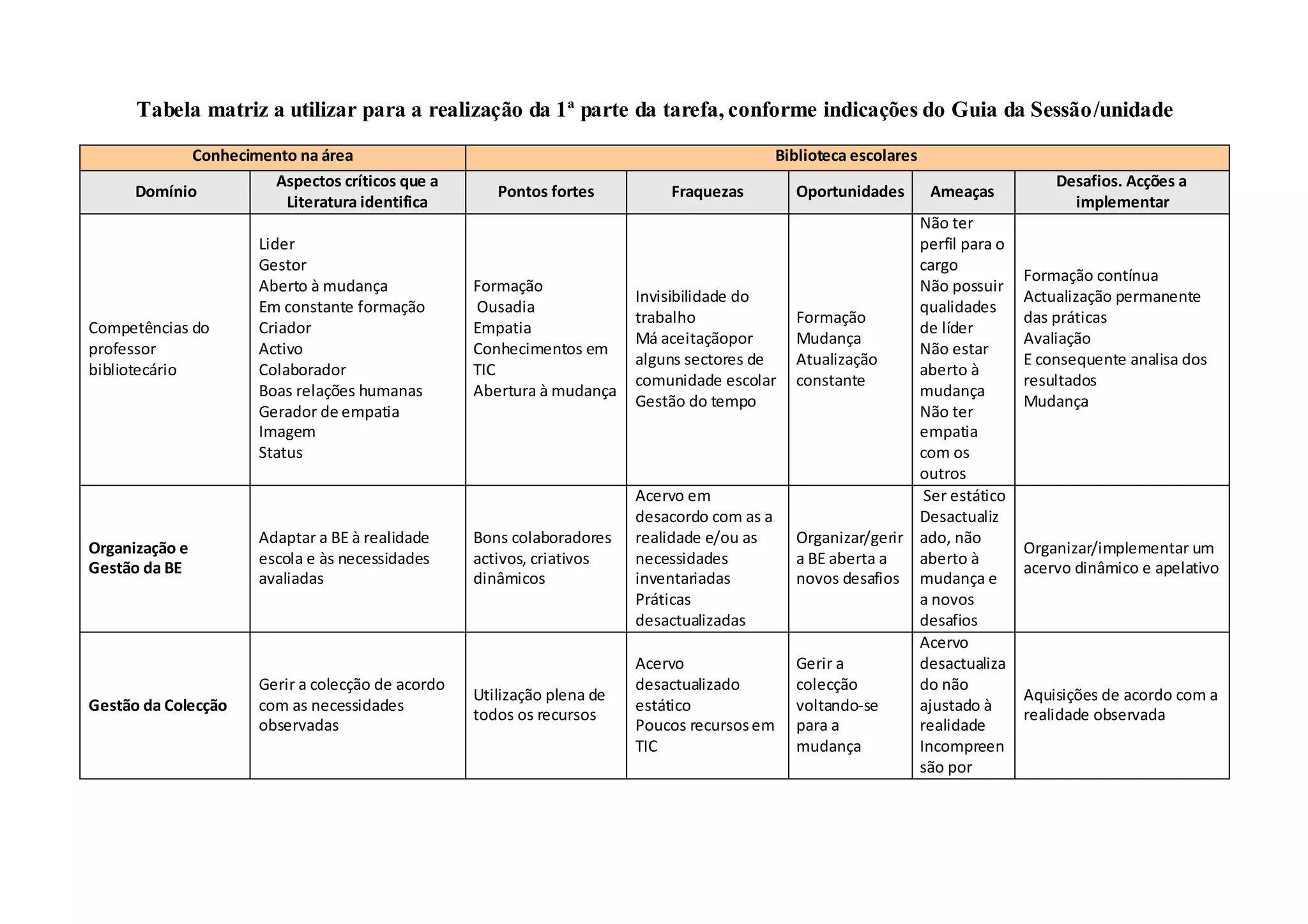 A biblioteca escolar enfrenta desafios como a visibilidade, a gestão do tempo e a aceitação por alguns sectores. Pontos fortes incluem a formação e a abertura à mudança. Acções prioritárias são avaliar e mudar práticas para contribuir para o sucesso escolar e construção do conhecimento através de atividades dinâmicas.
