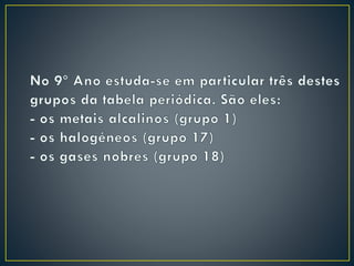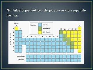 Dmitri Mendeleiev ordenou os elementos químicos conhecidos em uma tabela periódica que mostrava padrões nas propriedades dos elementos. Sua tabela previu novos elementos e serviu de base para a tabela periódica moderna, que organiza 118 elementos de acordo com suas propriedades.