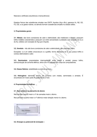 Este documento descreve a tabela periódica dos elementos, incluindo sua história, estrutura atual, propriedades gerais dos elementos e propriedades periódicas. A tabela periódica organiza os elementos químicos de acordo com seu número atômico e propriedades periódicas como raio atômico, energia de ionização e eletronegatividade. Isso permite prever tendências nas propriedades físicas e químicas dos elementos.