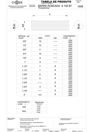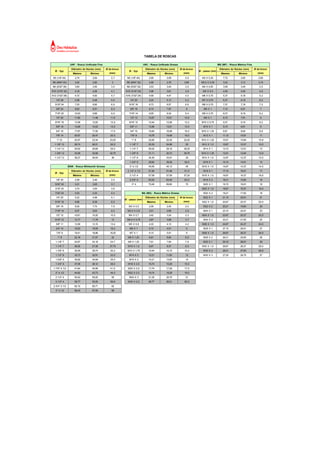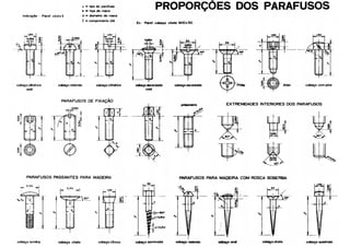 O documento fornece tabelas com dimensões de roscas métricas, roscas whitworth, roscas unificadas e roscas BSP. As tabelas incluem diâmetros nominais, número de fios por polegada e dimensões-chave de cada tipo de rosca.
