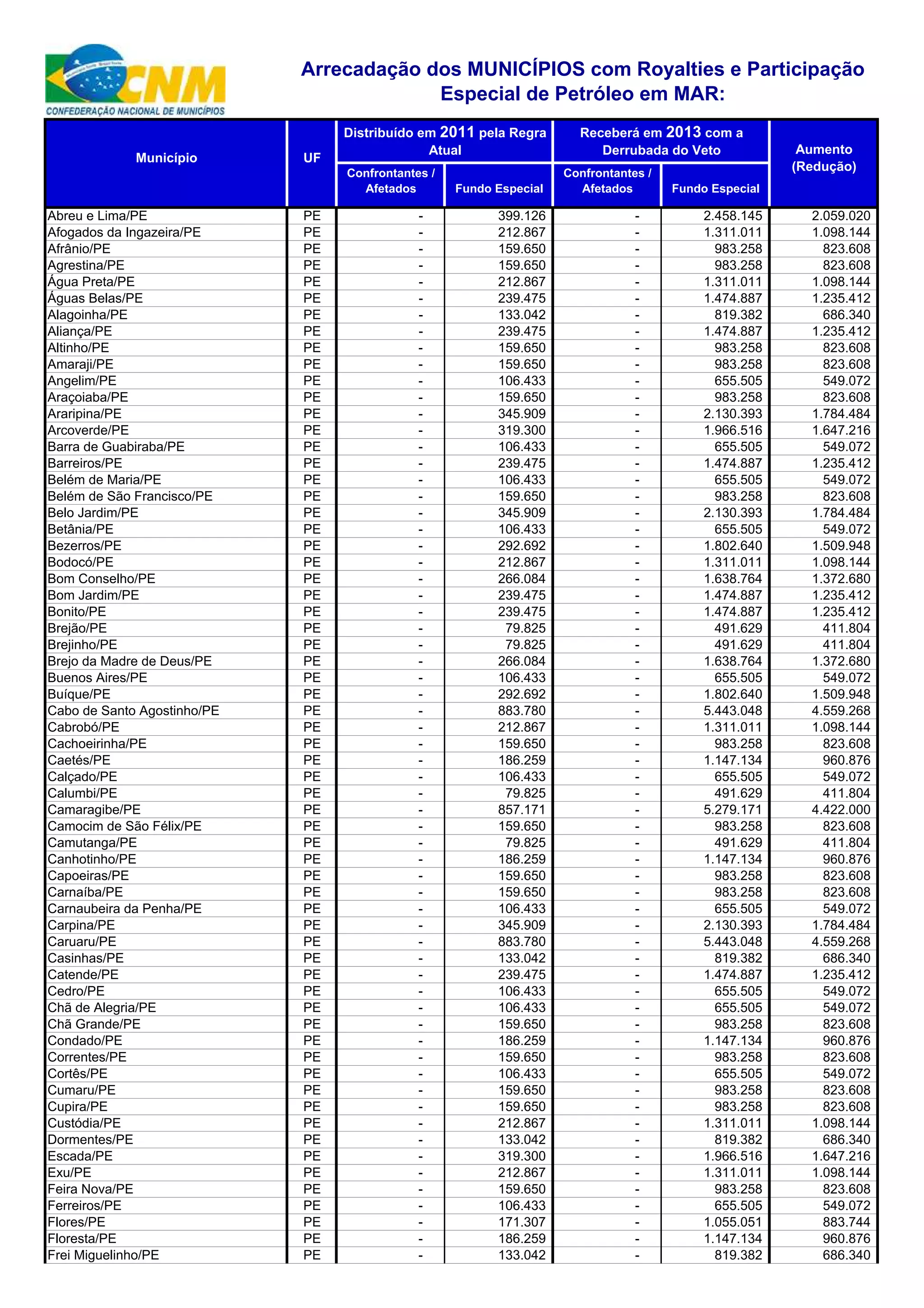 O documento lista as cidades de Pernambuco e os valores recebidos em 2011 e esperados em 2013 com a derrubada do veto para royalties e participação especial de petróleo. Muitas cidades terão um aumento significativo nos valores, em alguns casos mais do que dobrando o montante recebido.