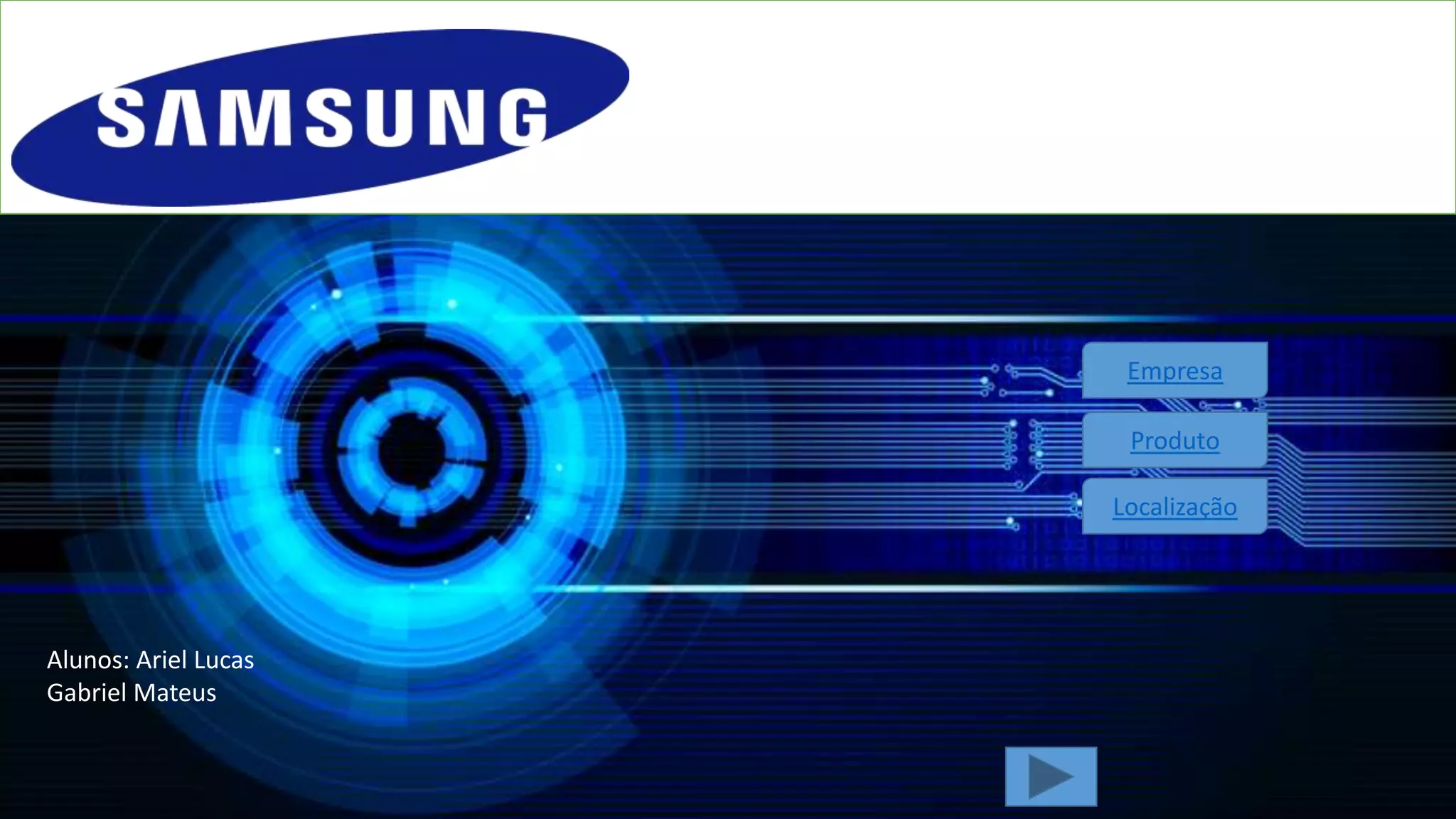 O documento descreve a história, produtos e localização da empresa Samsung. A Samsung é uma corporação multinacional sul-coreana atuante em tecnologia com receitas comparáveis ao PIB de países. Seus produtos incluem smartphones com sistema Android e telas touch. Sua fábrica fica localizada em Manaus, Amazonas.