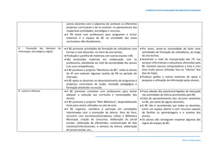 O documento descreve os indicadores e pontos fortes e fracos de uma biblioteca escolar em avaliação. O domínio D, que avalia a articulação da biblioteca com a escola, os serviços prestados e as condições materiais e humanas, parece requerer mais atenção devido à adesão parcial dos professores e limitações nos recursos humanos disponíveis.