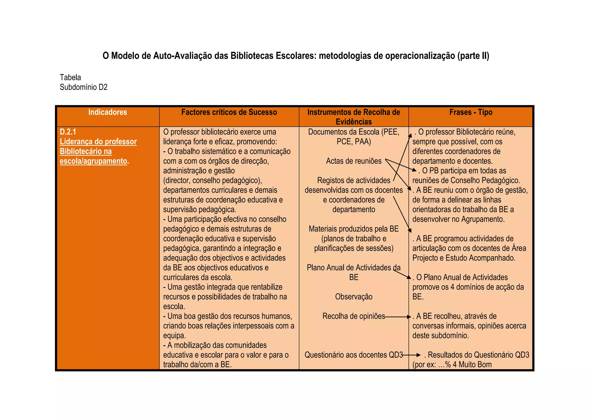 O documento descreve os indicadores e instrumentos de avaliação para o subdomínio D2 "Recursos" da biblioteca escolar. Aborda os recursos humanos, espaço físico e equipamentos tecnológicos, analisando sua adequação às necessidades da biblioteca e escola.