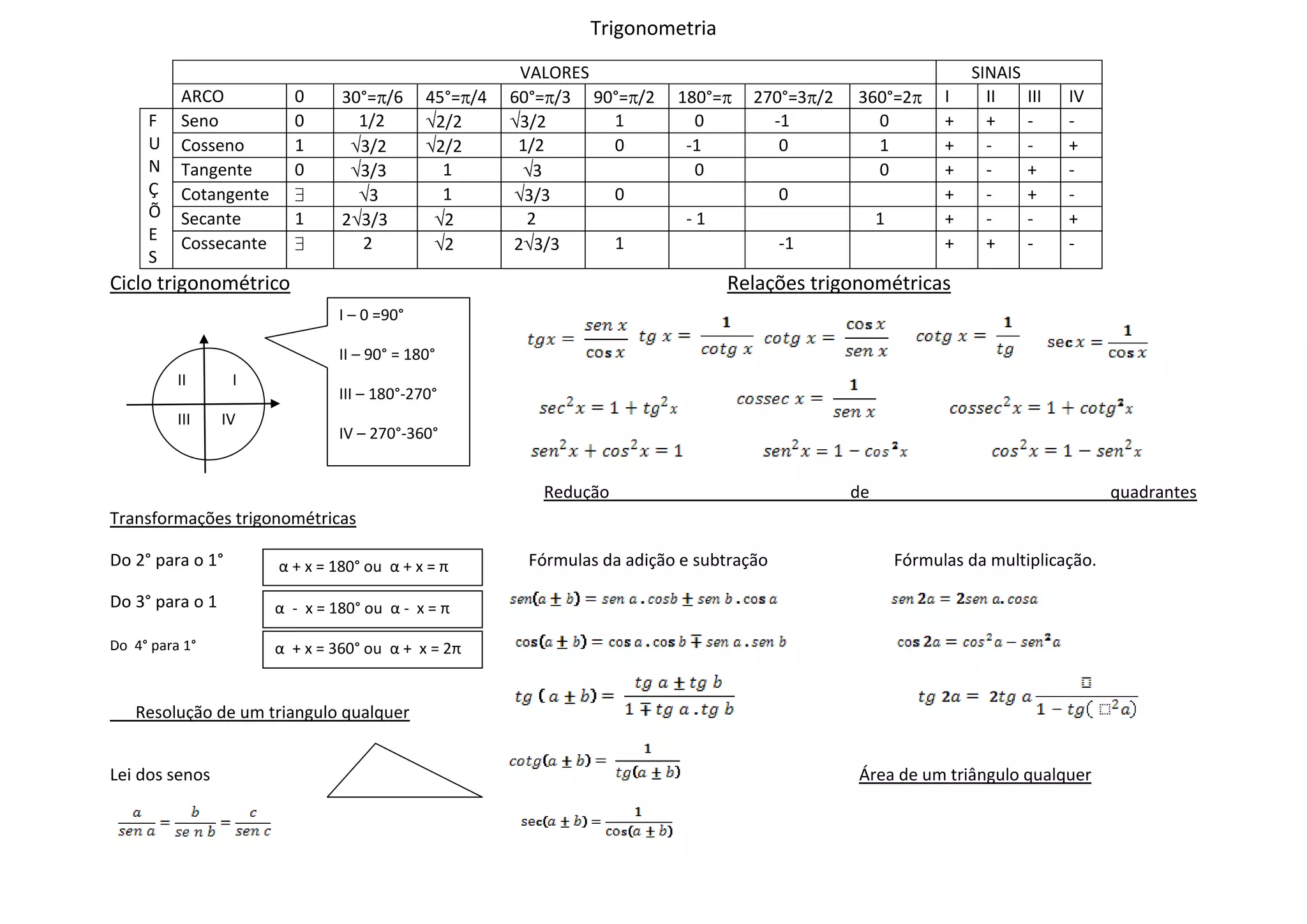 Este documento apresenta os principais conceitos de trigonometria, incluindo valores de funções trigonométricas para diferentes ângulos, relações trigonométricas, transformações trigonométricas, resolução de triângulos e conceitos como domínio, imagem e período. Ele fornece tabelas com valores de seno, cosseno, tangente e outras funções para ângulos de 0° a 360° e explica como usar leis de senos e cossenos para resolver triângulos.