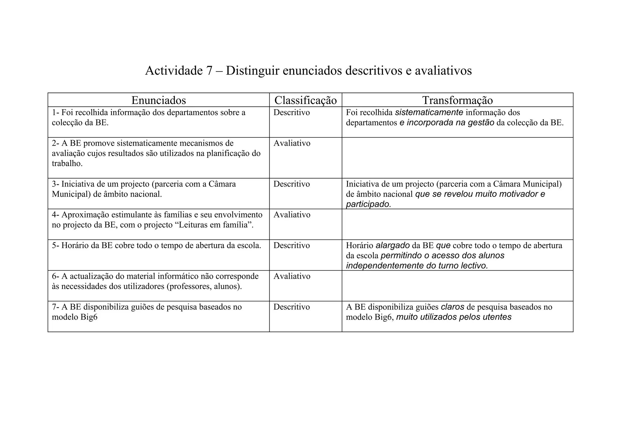 Este documento classifica 7 enunciados como descritivos ou avaliativos e propõe algumas transformações. 3 enunciados são descritivos sobre iniciativas e horários da biblioteca escolar. 4 enunciados são avaliativos e fazem juízos sobre mecanismos de avaliação, envolvimento familiar e atualização de equipamentos.