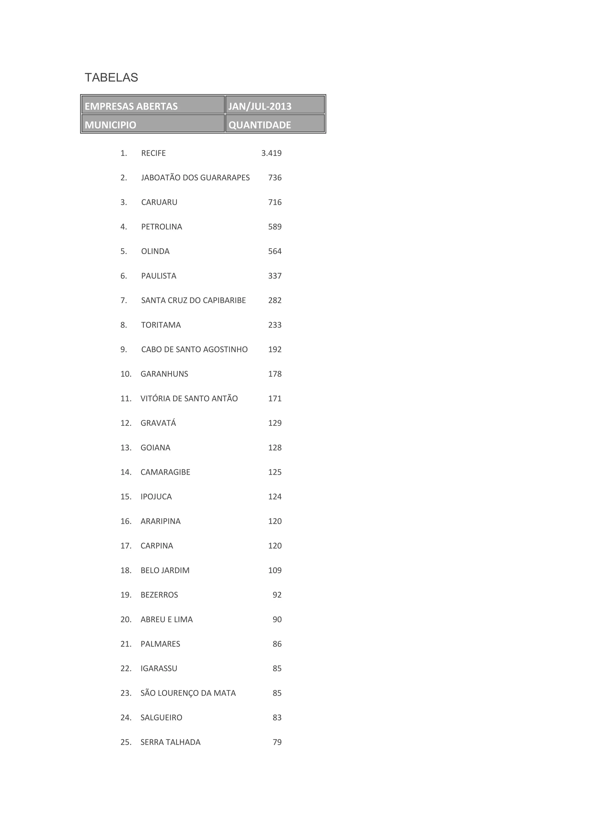 O documento apresenta estatísticas sobre o número de empresas abertas em municípios de Pernambuco entre janeiro e julho de 2013, com Recife liderando com 3.419 empresas. Também lista as atividades com maior número de registros, sendo o comércio varejista de artigos do vestuário o primeiro colocado.