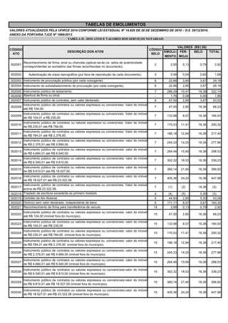 Este documento apresenta tabelas de valores de emolumentos cobrados por serviços judiciais e notariais no Estado do Ceará. A tabela I descreve valores para atos de distribuição de protestos e outros serviços do ofício de distribuição. A tabela II lista valores para serviços notariais como reconhecimento de firma, testamentos, escrituras e certidões. A tabela III detalha valores para serviços de protesto de títulos de acordo com o valor do título.