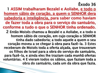 1. Deus deu instruções para a construção do tabernáculo e escolheu Bezalel e Aoliabe, dotando-os de habilidades, para liderar a obra.