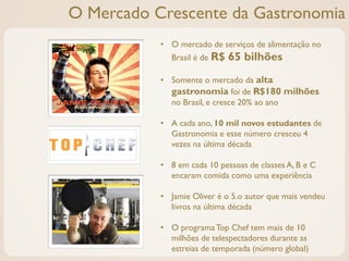 O documento apresenta o tableshare, um novo modelo de negócios online que conecta consumidores a chefs profissionais e amadores para experiências gastronômicas acessíveis. O mercado de alimentação no Brasil é significativo, com uma crescente valorização da gastronomia entre os consumidores. A plataforma visa democratizar o acesso à alta gastronomia através de um marketplace que permite várias modalidades de atendimento, incluindo delivery e refeições em casa.