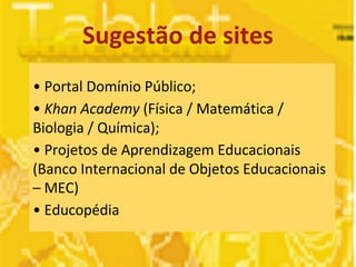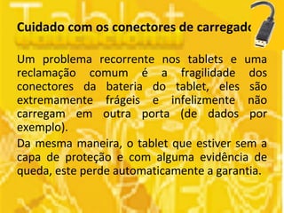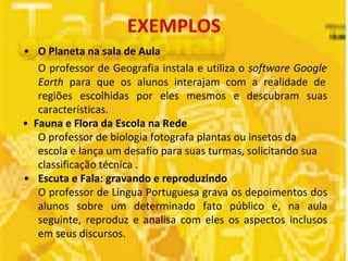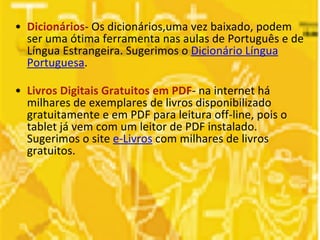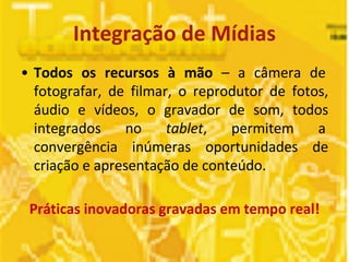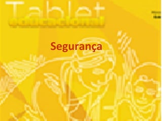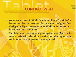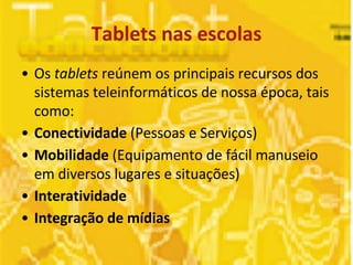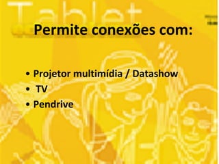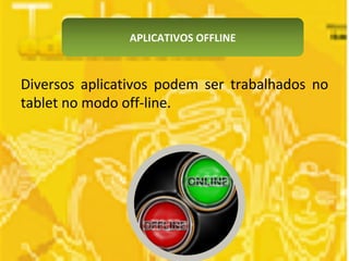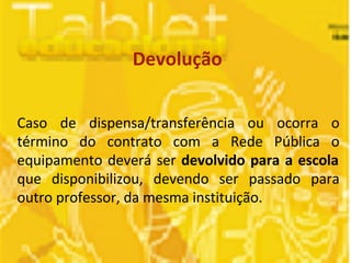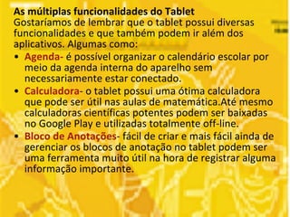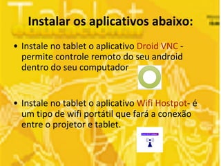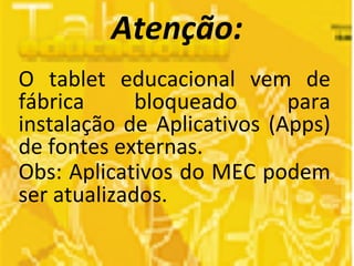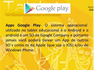 O documento fornece instruções sobre o uso de tablets educacionais, incluindo como conectá-los a projetores, acessar arquivos em pendrives e baixar conteúdos educativos. Também discute aplicativos úteis e como instalar novos aplicativos na loja Google Play.