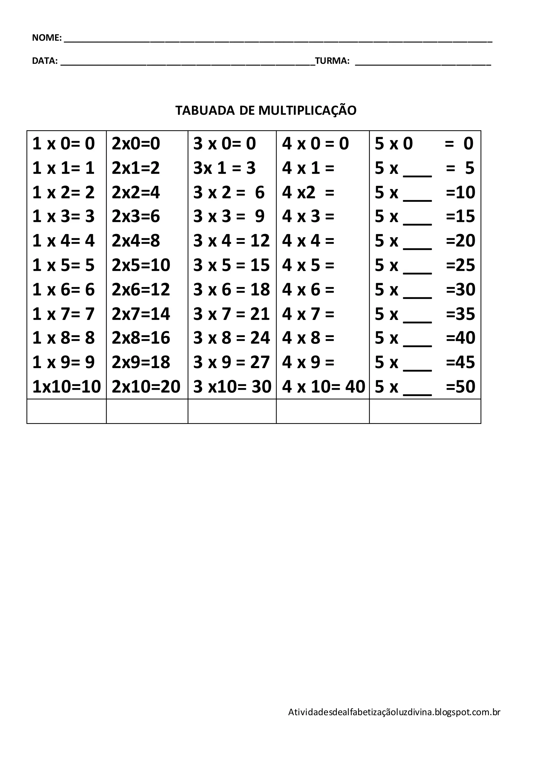 Este documento contém duas tabelas: (1) uma tabela da tabuada de multiplicação de 1 a 5; (2) uma tabela de Pitágoras para preencher os resultados da multiplicação de 7 por números de 1 a 10.