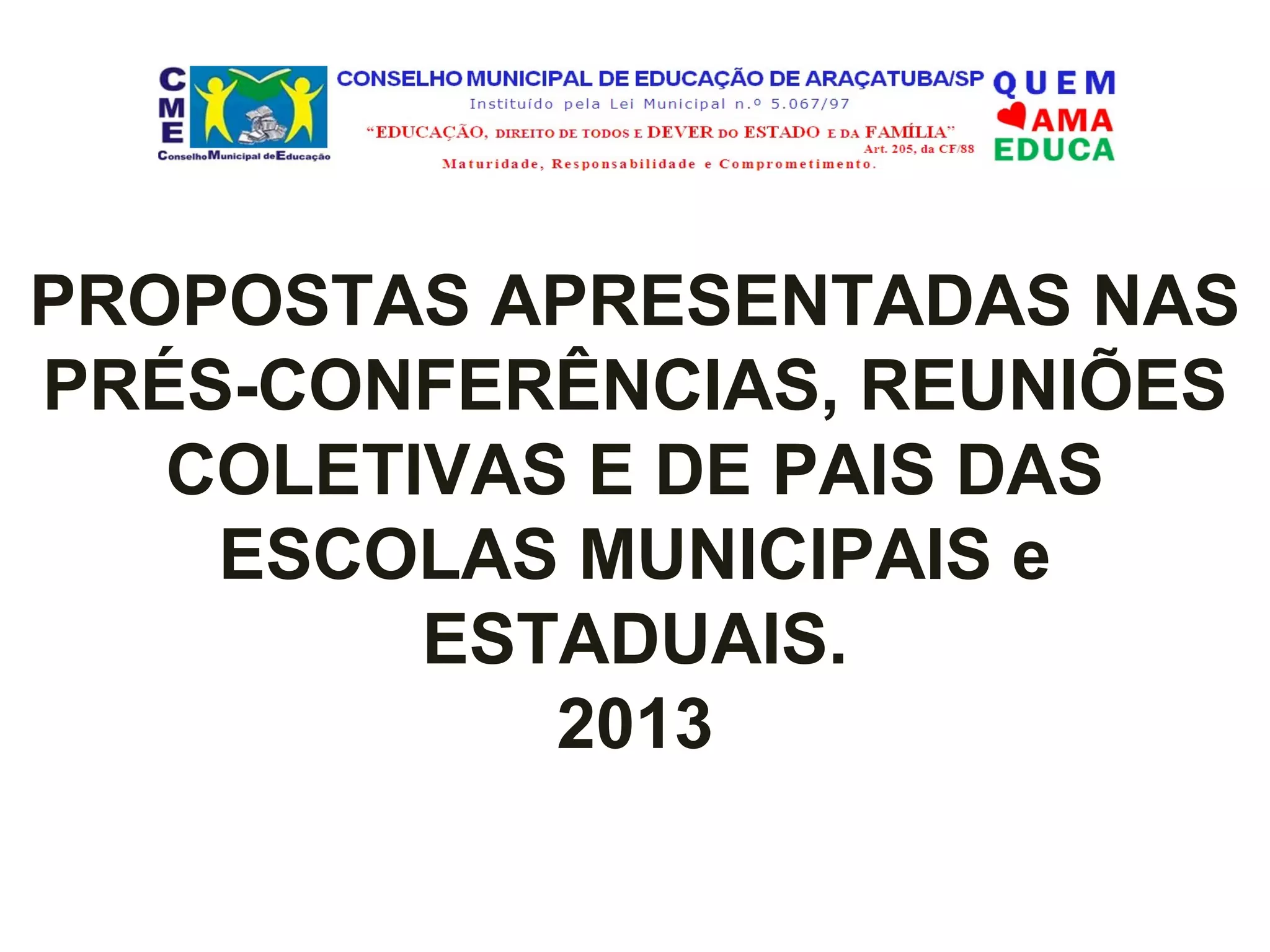 Este documento apresenta propostas coletadas em reuniões com escolas municipais e estaduais sobre educação em 2013. As propostas abrangem diversas áreas como oferta de ensino infantil, fundamental, médio e superior, evasão escolar, merenda, transporte, educação especial, bibliotecas, espaço físico, avaliação, formação de professores, violência, educação profissionalizante e participação da comunidade.