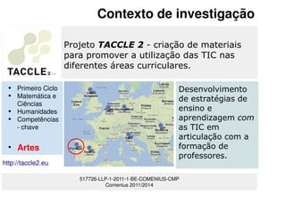 Este documento descreve uma pesquisa que visa desenvolver estratégias para professores de artes usarem TIC de forma integrada no currículo. A pesquisa envolveu professores experientes em brainstorming soluções e testando atividades práticas. Os resultados sugeriram que as atividades devem ter estrutura flexível para atender diferentes contextos pedagógicos.