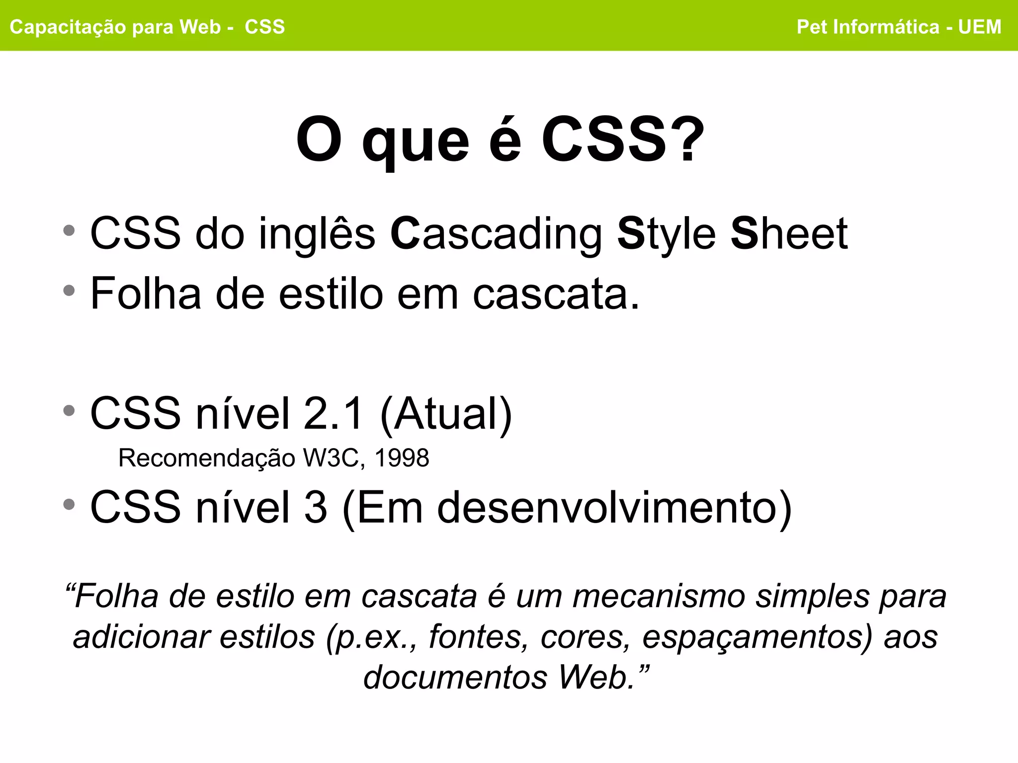CSS (Cascading Style Sheets ou Folhas de Estilo em Cascata) é uma linguagem de estilo usada para descrever a apresentação de documentos HTML e XML, separando seu conteúdo da sua apresentação visual. CSS permite definir estilos para elementos como fontes, cores, espaçamentos e layout de páginas da web de forma a melhorar a acessibilidade, manutenção e separação entre conteúdo e visualização.