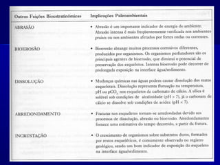Tafonomia estuda os processos de transição de restos orgânicos da biosfera para a litosfera, analisando como esses processos afetam as informações biológicas preservadas. Engloba a análise da história sedimentar dos restos até o enterramento e as alterações posteriores, como a necrólise.