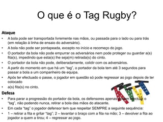O documento descreve as regras básicas do Tag Rugby. O objetivo do jogo é marcar ensaios atravessando a linha final com a bola nas mãos. A defesa só pode fazer "tag" nos atacantes, retirando uma fita do cinto, em vez de tirar a bola. Os jogos duram 10 minutos divididos em dois tempos de 5 minutos cada.
