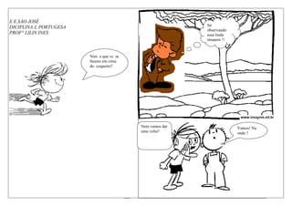 O documento apresenta uma atividade escolar sobre a produção de histórias em quadrinhos. As instruções incluem escolher personagens, definir seus nomes, e começar a criar a história em quadrinhos. Exemplos iniciais mostram dois personagens, Nim e Emanuel, passeando na praia e floresta e ajudando uma tartaruga ferida.