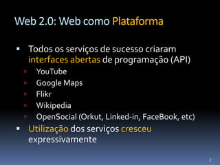 O documento discute a evolução da web 2.0 e sua implementação na mobilidade, destacando a importância de interfaces abertas e serviços personalizados através de operadores móveis. Apresenta o 'torpedão', uma solução que permite a criação de serviços sociais via celular, e enfatiza a necessidade de agregar valor de forma controlada. A plataforma proposta, 'torpedão 2.0', oferece uma API pública para que terceiros desenvolvam novos serviços, transformando a rede da operadora em um espaço colaborativo e aberto.