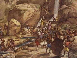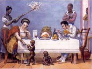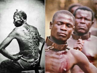 A escravidão começou no Brasil no século XVI com os colonos portugueses escravizando os índios e depois os negros trazidos da África para trabalhar nas lavouras de açúcar e minas de ouro. Os escravos sofriam maus tratos, dormiam em condições insalubres e recebiam castigos físicos por seu trabalho árduo e perigoso. A escravidão só terminou no Brasil em 1888 com a Lei Áurea assinada pela princesa Isabel.