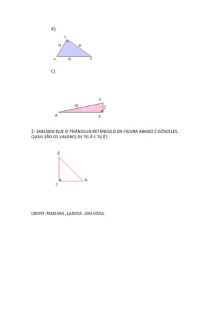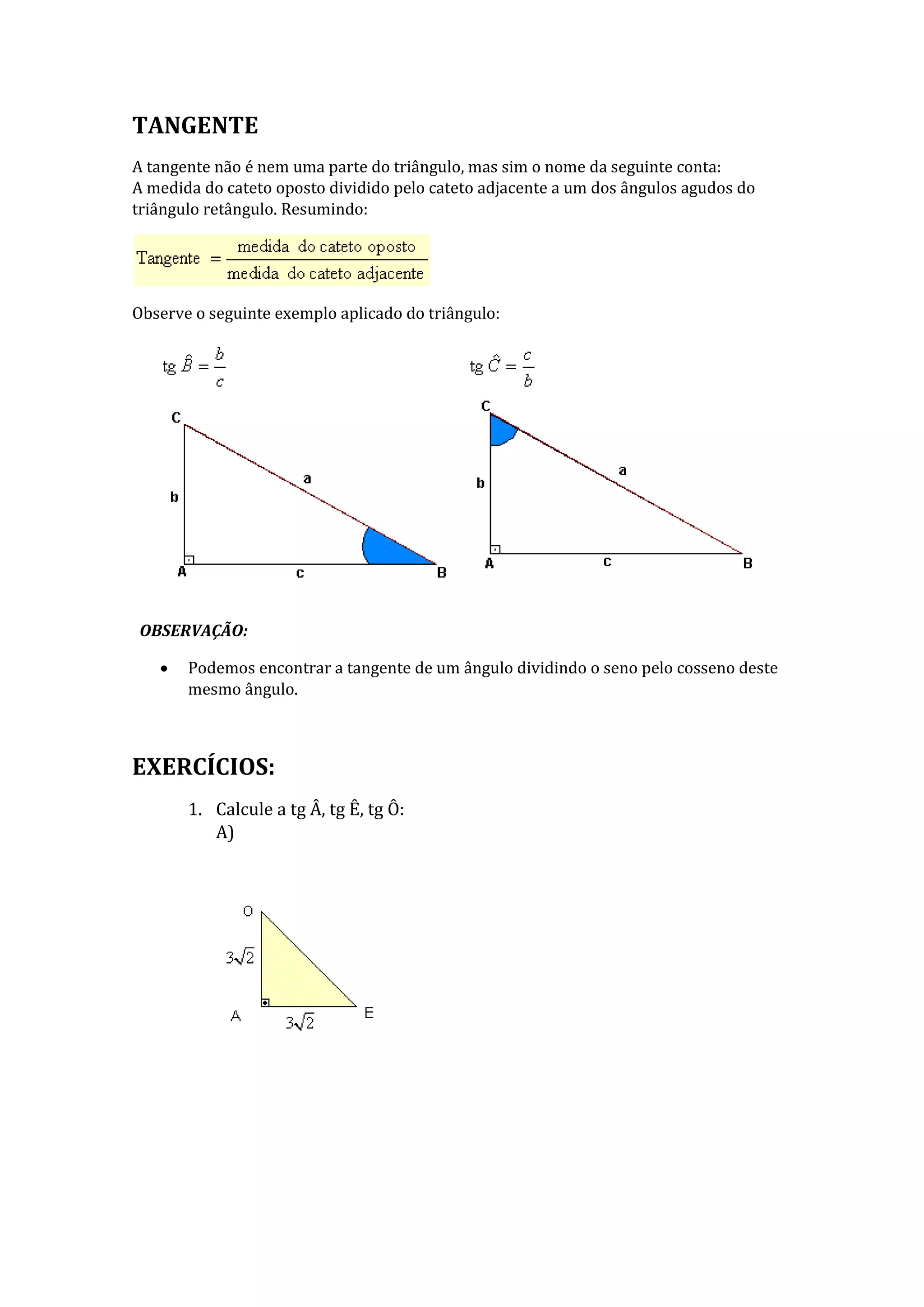 A tangente de um ângulo agudo em um triângulo retângulo é calculada dividindo o cateto oposto pelo cateto adjacente ao ângulo. A tangente também pode ser calculada dividindo o seno pelo cosseno do ângulo. Exemplos de problemas de cálculo de tangentes em triângulos retângulos são fornecidos.