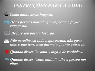 Este documento contém um poema/totem tântrico nepalês sobre boa sorte e conselhos de vida. Alguns dos conselhos incluem comer arroz integral, dar mais do que o esperado, amar profunda e apaixonadamente, respeitar a si mesmo e aos outros, e viver uma vida honesta para desfrutar do passado quando velho.