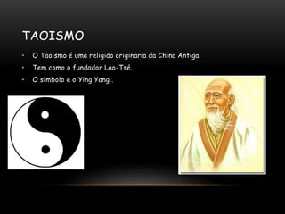 O documento descreve os principais aspectos do Taoismo, incluindo sua origem na China Antiga, o fundador Lao-Tsé, os símbolos como yin-yang, as divindades como Xiwangmu e Chang'e, os fundamentos como não-violência e simplicidade, e os lugares sagrados como Dòngtian e Monte Penglai.