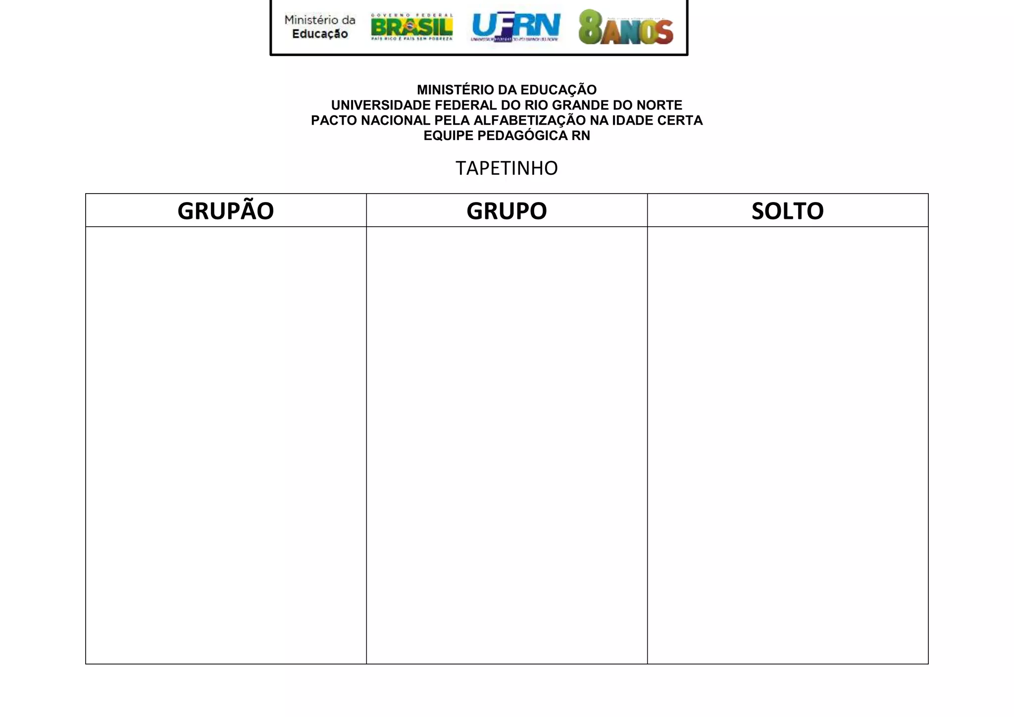 O documento trata de um pacto nacional para alfabetização na idade certa, com menção a uma equipe pedagógica do Rio Grande do Norte e as estratégias "Tapetinho" e "Grupão Grupo Solto" para melhorar a alfabetização.