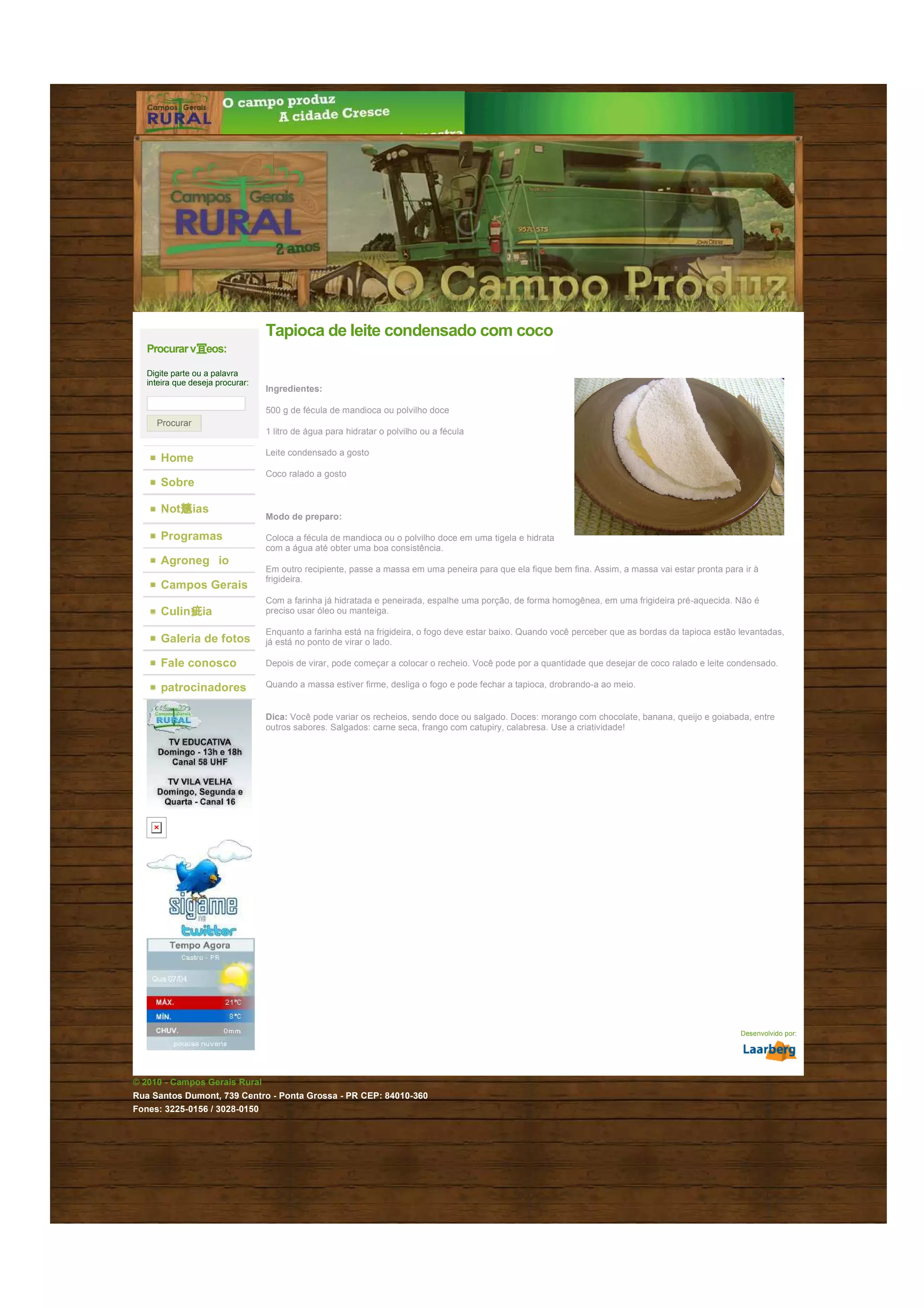 Este documento fornece uma receita para tapioca de leite condensado com coco. A receita inclui ingredientes como fécula de mandioca, água, leite condensado e coco ralado. O modo de preparo envolve hidratar a fécula, cozinhar a massa em uma frigideira e rechear com leite condensado e coco.