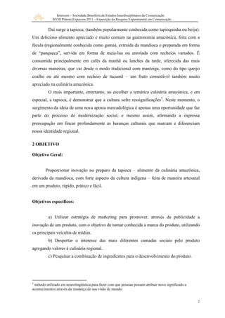 O documento descreve uma pesquisa sobre o desenvolvimento de um novo produto alimentar chamado Tapioquinha Sinhazinha, preparado no micro-ondas. O objetivo era inovar no preparo da tapioca, um alimento típico da culinária amazônica, de forma prática e rápida. Foi realizada uma pesquisa de mercado e desenvolvido um vídeo publicitário para promover o produto e tornar a marca conhecida, utilizando valores culturais regionais como a herança indígena.