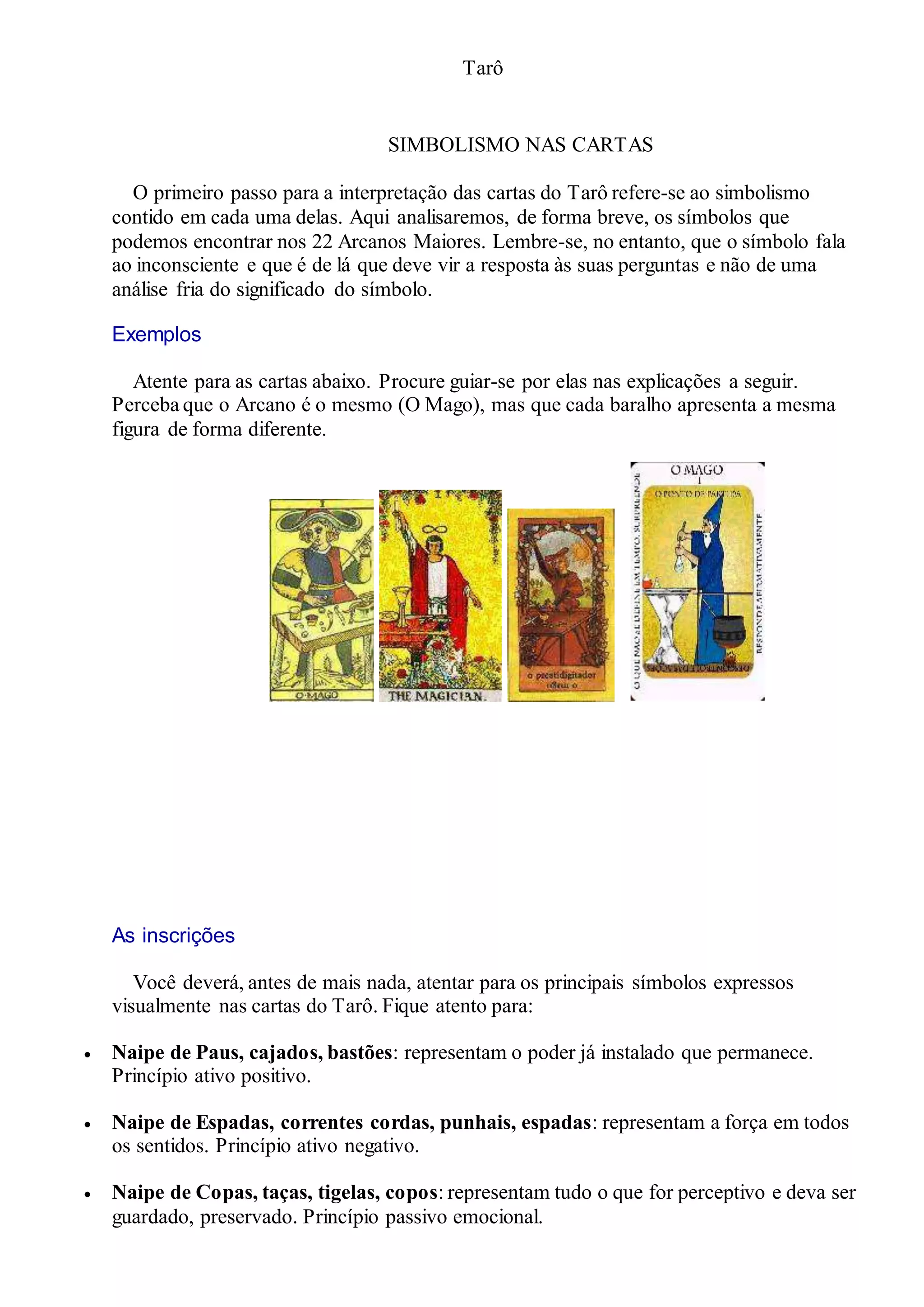 O documento discute os símbolos e significados encontrados nas cartas do Tarô, incluindo naipes, posições geométricas, cores, direção e posição das figuras. Explica o significado de cada Arcano Maior, como O Mago, A Papisa, A Imperatriz e outros, com ênfase no simbolismo de cada carta.