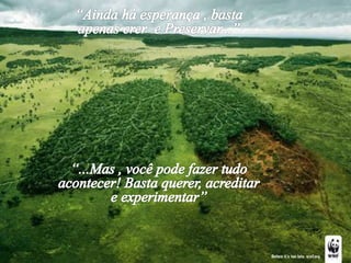 O documento discute a importância da preservação do meio ambiente e como pequenas ações individuais podem fazer a diferença. Várias frases enfatizam que "Você pode fazer tudo acontecer! Basta querer, acreditar e experimentar" e que cuidando do planeta, ele pode nos dar outra chance no futuro.
