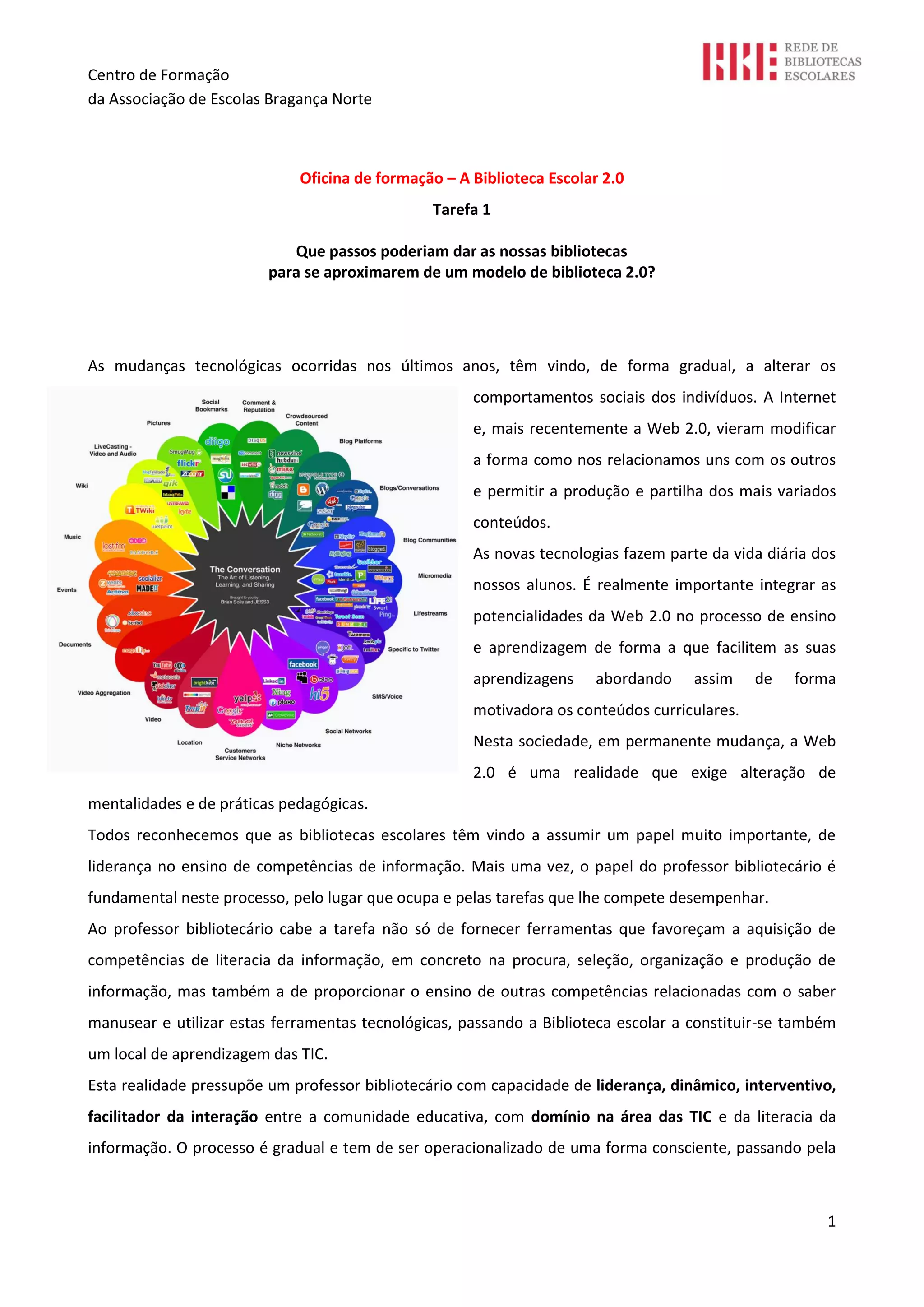 O documento discute como as bibliotecas escolares podem se aproximar do modelo de biblioteca 2.0. Ele descreve como as tecnologias da Web 2.0 permitem novas formas de interação e compartilhamento de conteúdo. Também sugere que as bibliotecas escolares devem integrar essas ferramentas para envolver os alunos e apoiar o aprendizado. Finalmente, fornece alguns exemplos de como as bibliotecas já estão começando a adotar blogs, sites e redes sociais, mas ainda precisam fazer mais para atingir