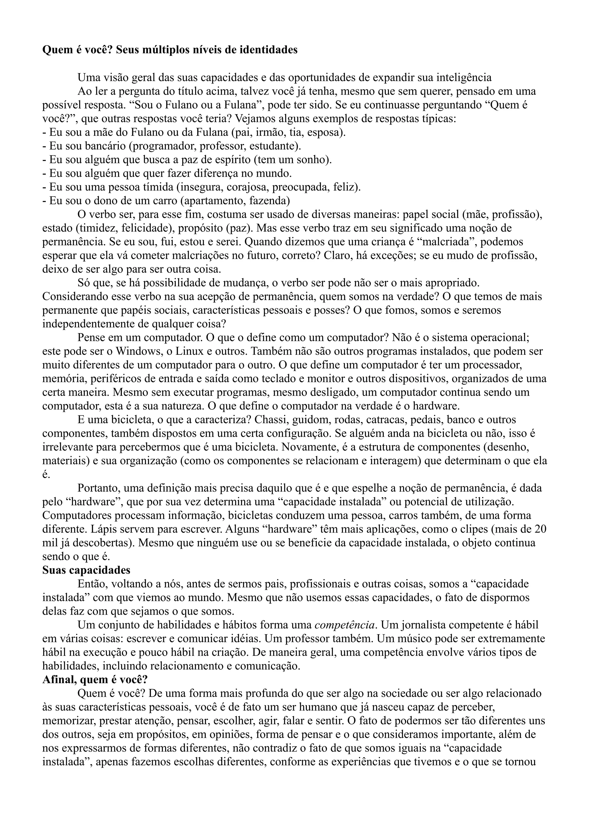 O documento discute os diferentes níveis de identidade de uma pessoa, incluindo sua capacidade inata como ser inteligente e suas identidades sociais como filho, amigo, profissional. Argumenta que, embora as pessoas sejam diferentes em termos de propósitos e experiências, compartilham a mesma capacidade fundamental de percepção, pensamento e ação.