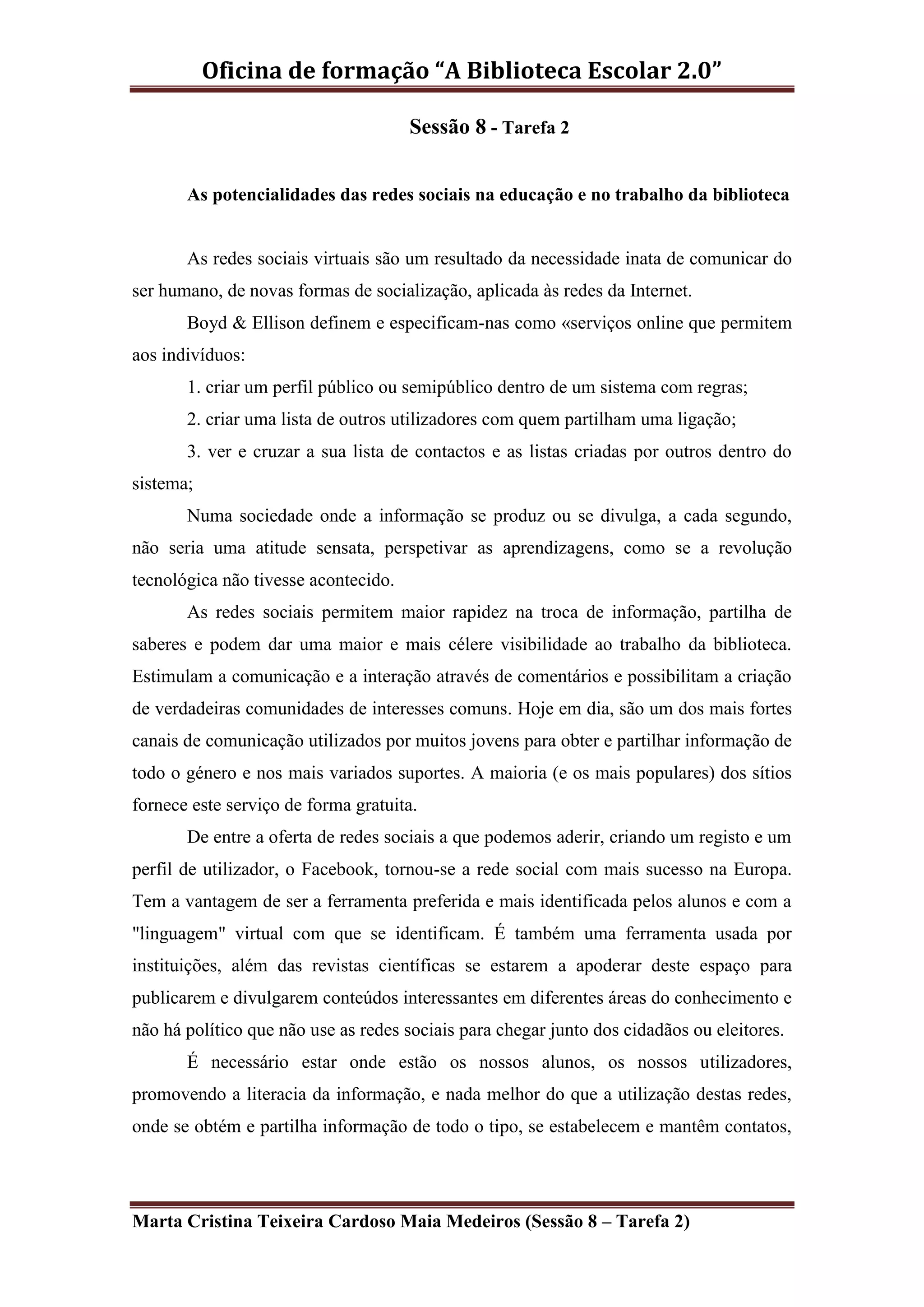 O documento discute o potencial das redes sociais na educação e no trabalho da biblioteca escolar. Ele define redes sociais e explica como elas permitem a troca rápida de informação e a criação de comunidades. Também destaca os desafios de segurança e a necessidade de educar os alunos sobre o uso seguro das redes sociais.