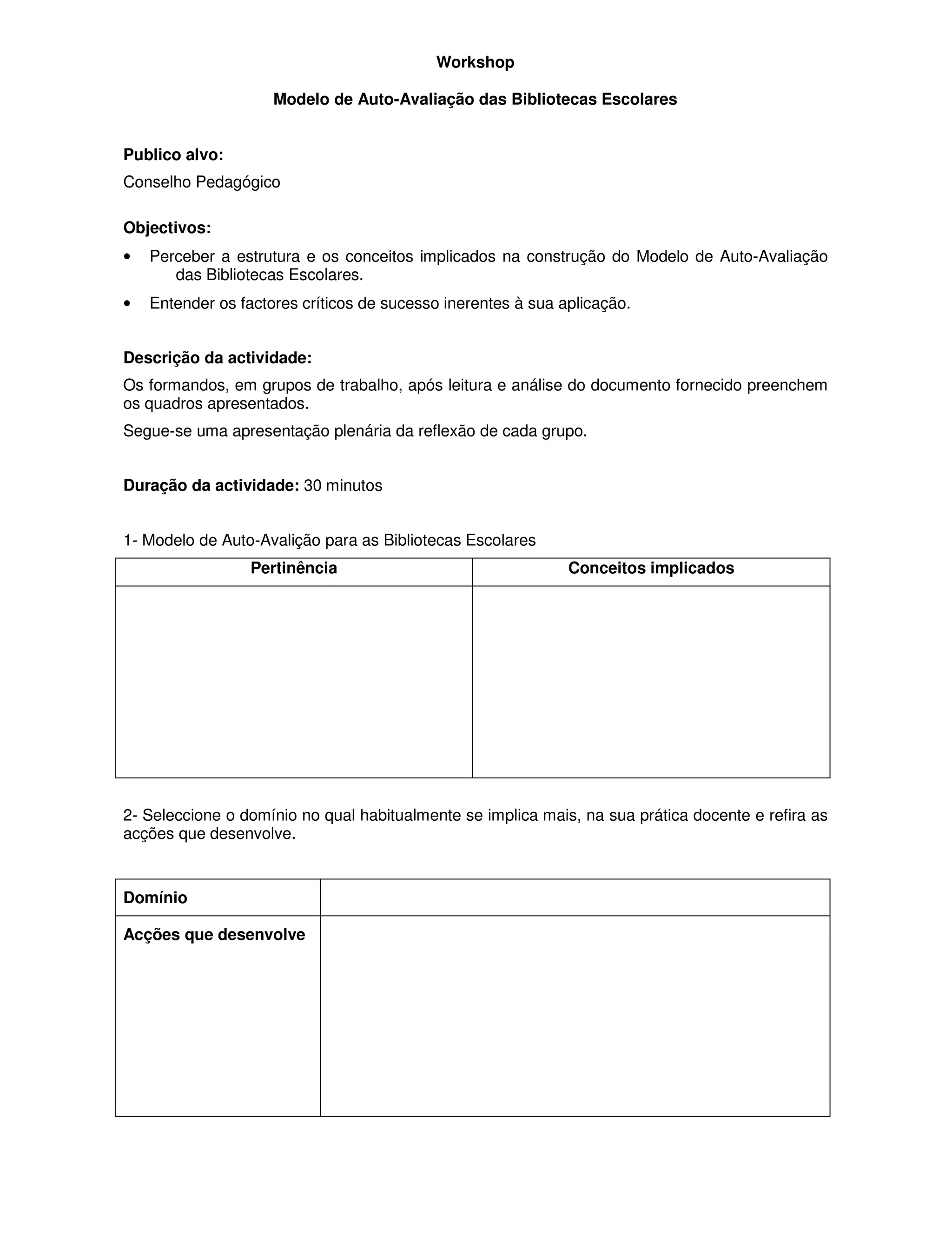 O documento descreve um workshop sobre um modelo de autoavaliação para bibliotecas escolares. O objetivo é ajudar as escolas a avaliar a estrutura e conceitos envolvidos na construção do modelo, bem como os fatores críticos de sucesso para sua aplicação, a fim de melhorar o desempenho das bibliotecas. O workshop inclui análise do documento do modelo em grupos e apresentações para discussão.