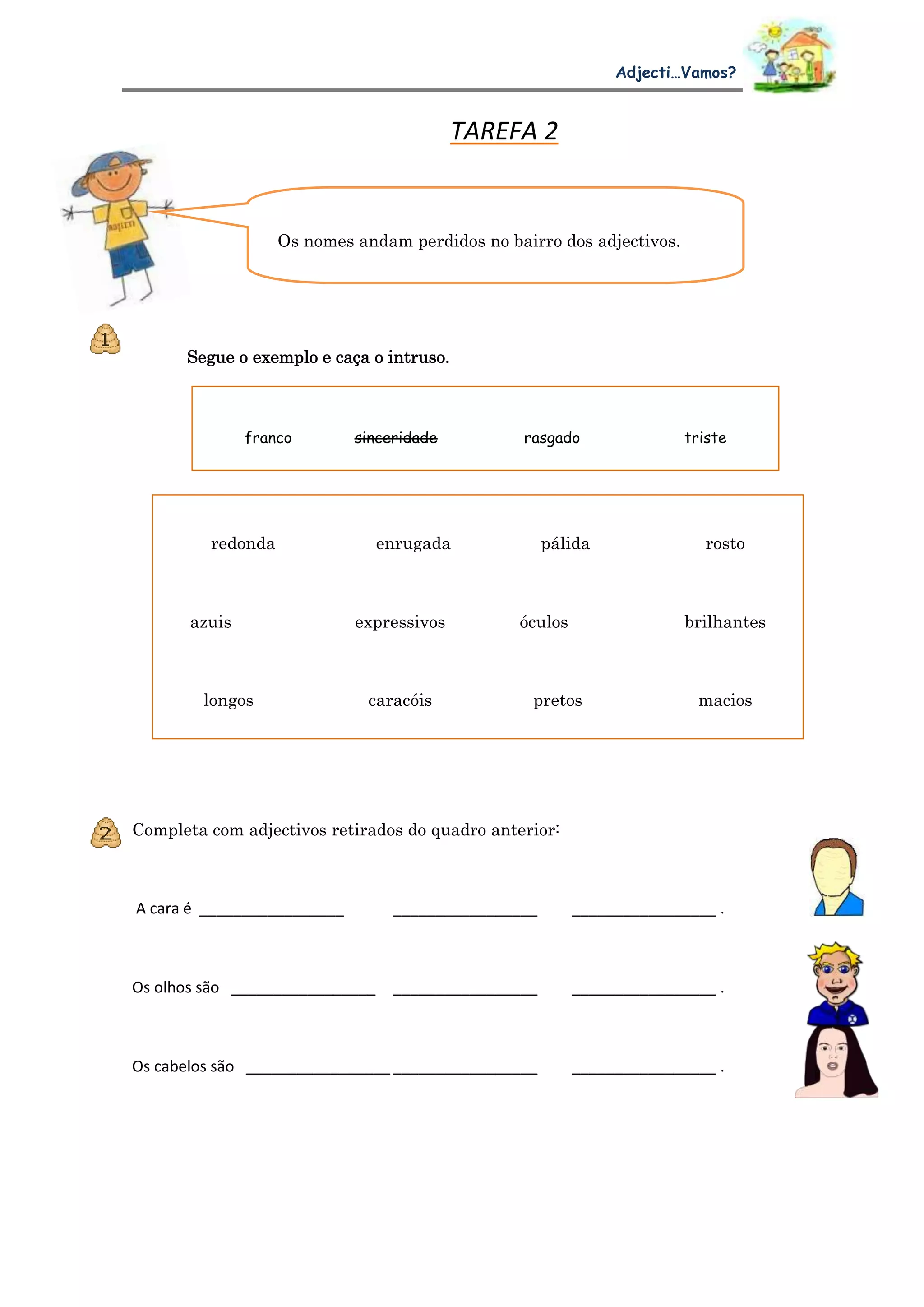 Este documento fornece uma lista de adjetivos e instruções para completar uma descrição física usando esses adjetivos. Os alunos devem escolher adjetivos da lista anterior para descrever uma cara, olhos e cabelos.