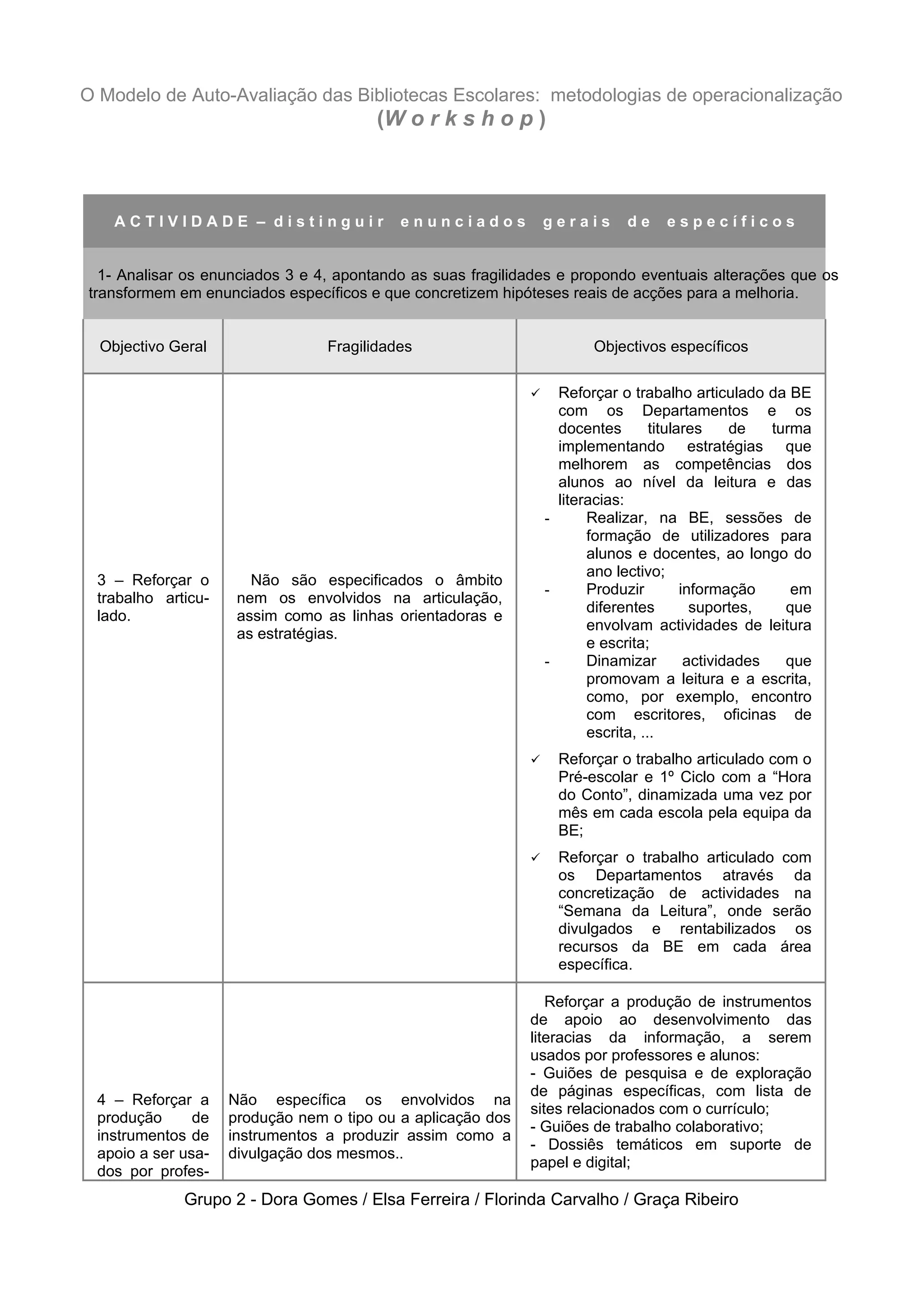 Este documento discute como melhorar os objetivos gerais 3 e 4 do Modelo de Auto-Avaliação das Bibliotecas Escolares através de objetivos mais específicos. Ele propõe objetivos específicos para: 1) reforçar o trabalho articulado entre a biblioteca escolar, departamentos e professores para melhorar as competências dos alunos em leitura e literacia; e 2) reforçar a produção de instrumentos de apoio às literacias da informação a serem usados por professores e alunos.