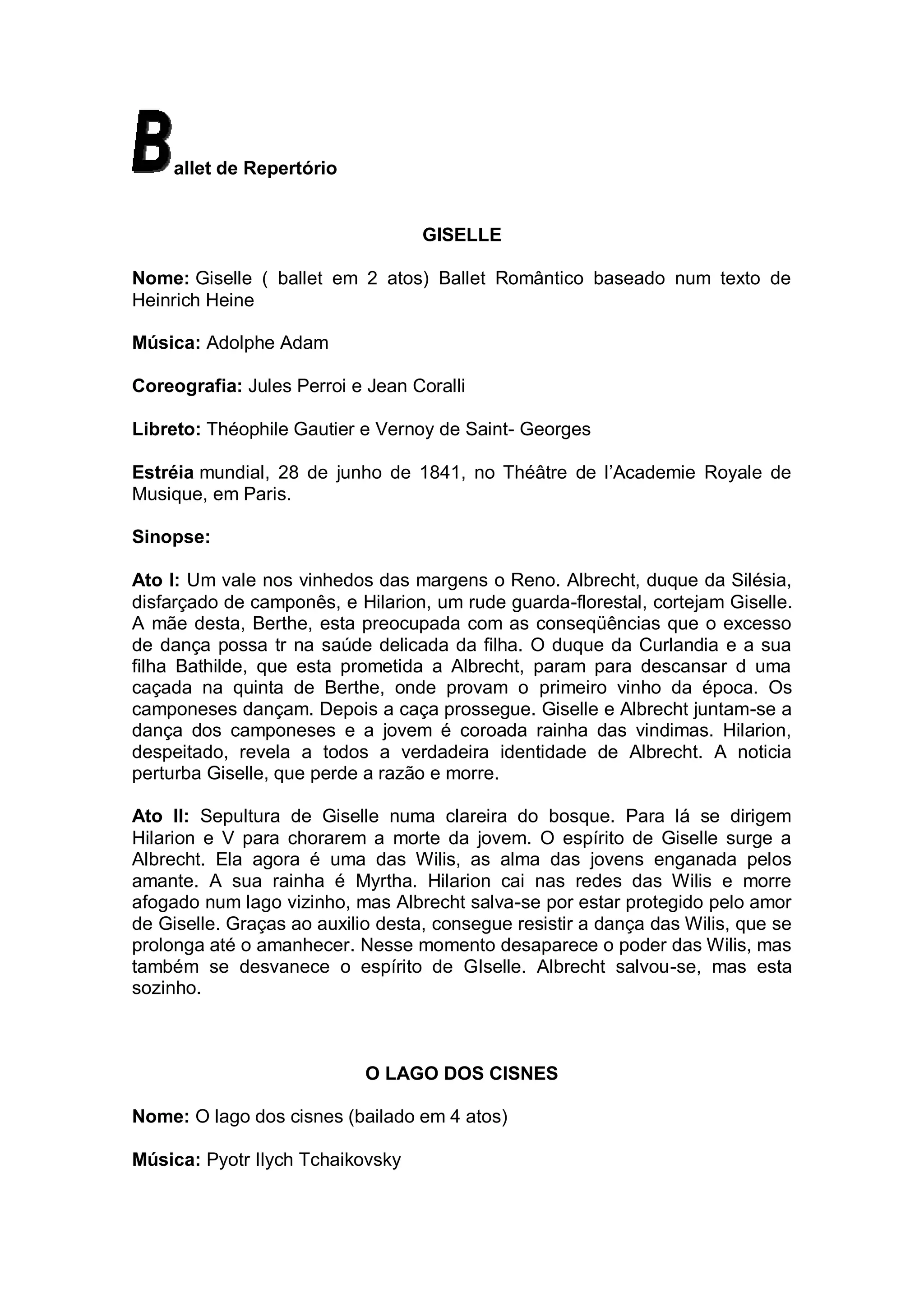 Giselle é um ballet romântico do século 19 sobre uma jovem camponesa que morre de desgosto após descobrir que seu amado é na verdade um duque disfarçado. No segundo ato, seu espírito torna-se uma Wilis, espíritos de noivas mortas, e dança até o amanhecer. O Lago dos Cisnes conta a história de uma princesa transformada em cisne durante o dia por um feiticeiro, só recuperando sua forma humana à noite. O príncipe Siegfried jura quebrar o fe