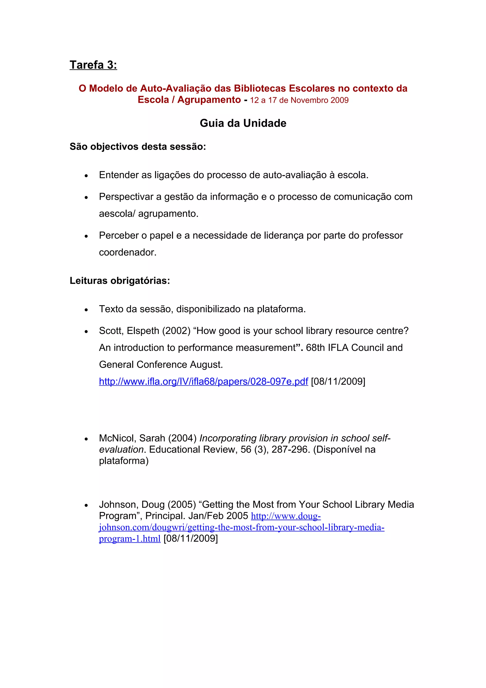 Este documento fornece instruções para uma tarefa sobre a auto-avaliação de bibliotecas escolares. Contém dois objetivos principais: 1) Entender como o processo de auto-avaliação se relaciona com a escola e como gerir informações e comunicações; 2) Reconhecer o papel de liderança do coordenador da biblioteca. Os participantes devem escolher entre duas tarefas, ambas envolvendo analisar a auto-avaliação em seu contexto escolar e comentar o trabalho de um colega.