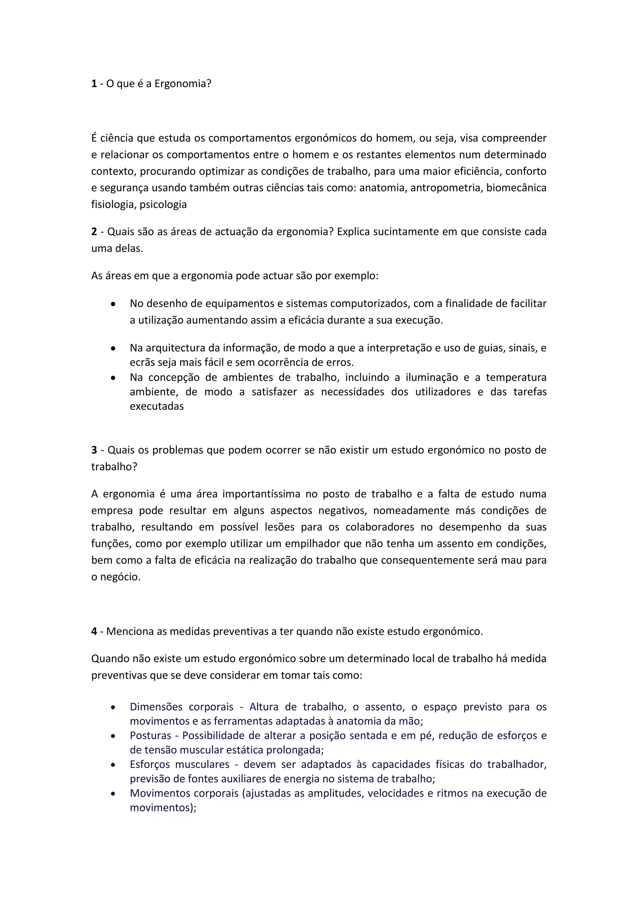 O documento discute o que é ergonomia, suas áreas de atuação e como a falta de estudos ergonômicos pode causar problemas. A ergonomia estuda a interação entre o homem e seu ambiente de trabalho para melhorar o conforto, eficiência e segurança. Sem estudos ergonômicos, há maior risco de lesões e menor produtividade devido a condições inadequadas.