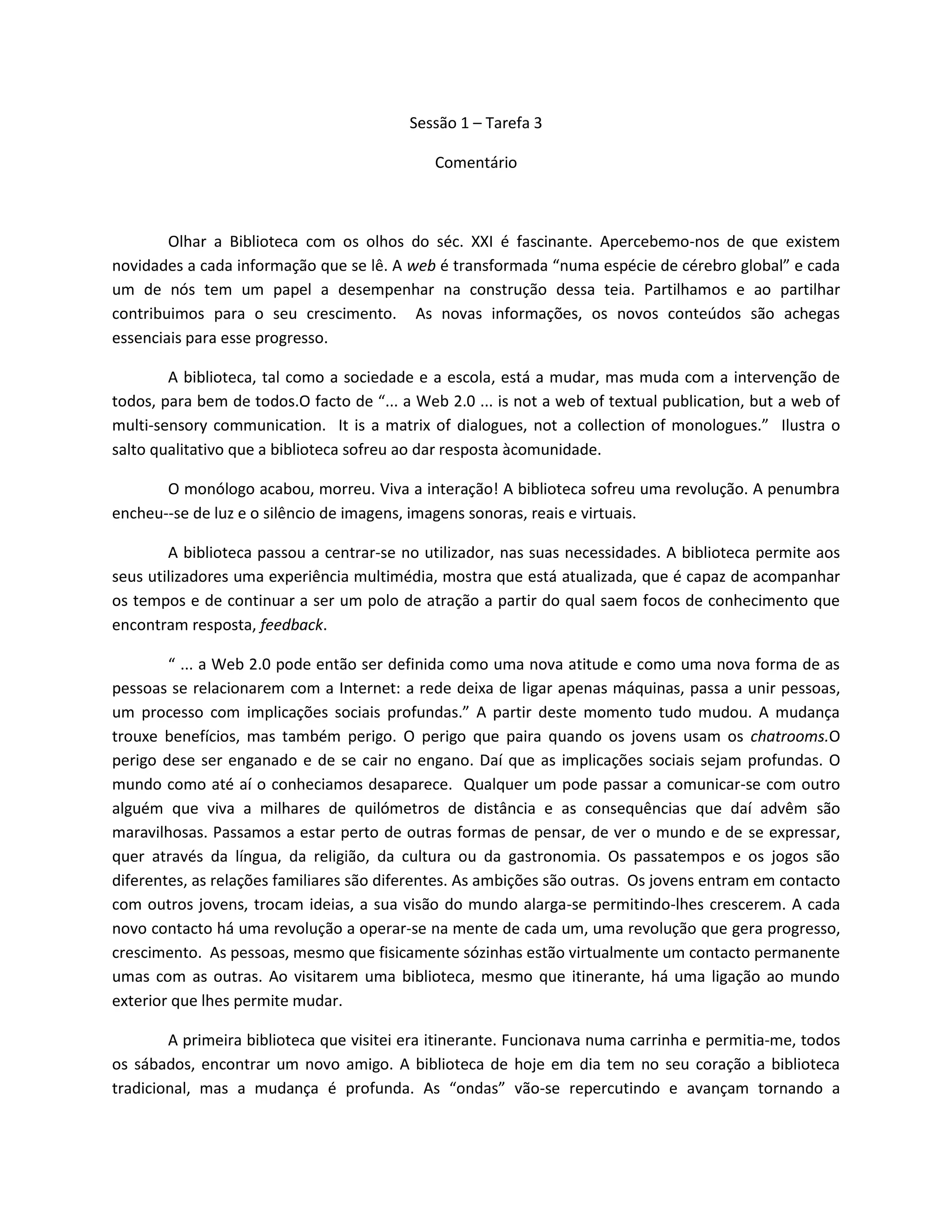 Este documento discute a evolução das bibliotecas com a Web 2.0, tornando-se locais mais interativos, colaborativos e centrados no usuário. As bibliotecas agora oferecem recursos multimídia e digitais que permitem novas formas de aprendizagem e comunicação na comunidade. Embora tenham mudado com a tecnologia, bibliotecas continuam sendo centros importantes de descoberta e compartilhamento de conhecimento.