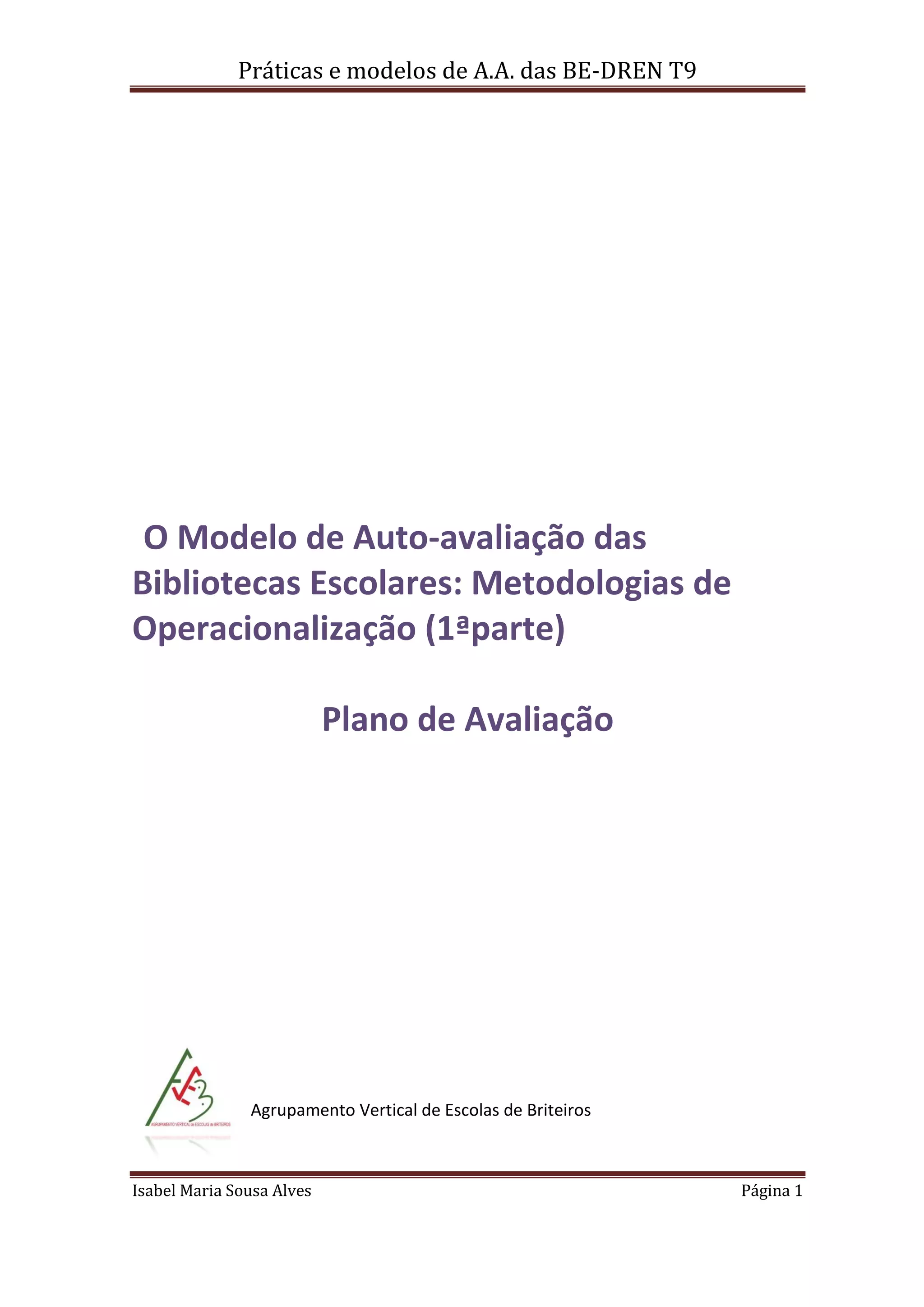 Este documento descreve o modelo de autoavaliação de bibliotecas escolares, incluindo a identificação do domínio a avaliar, fatores críticos de sucesso, ações, evidências, instrumentos de coleta de dados, intervenientes, cronograma e análise dos resultados. O objetivo é melhorar as práticas da biblioteca para apoiar o desenvolvimento curricular e as competências dos alunos.