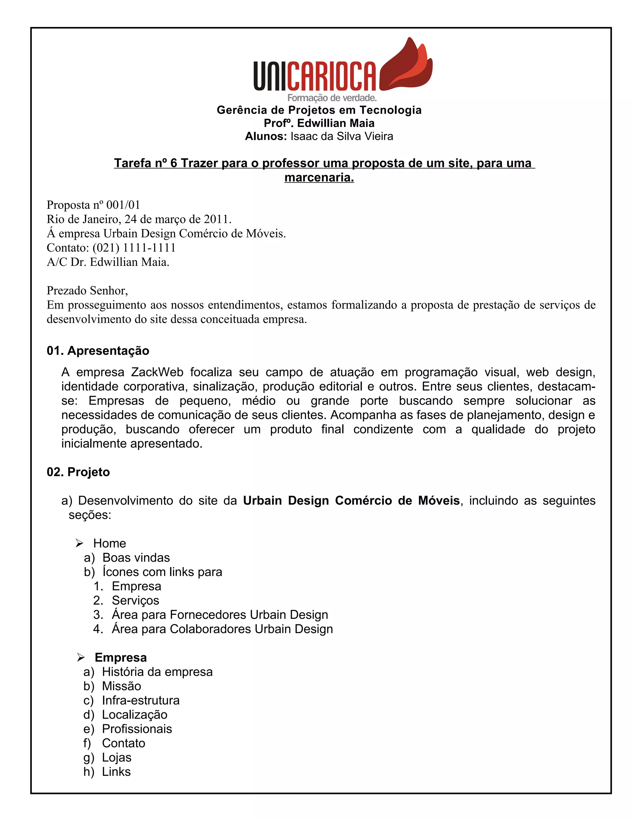O documento propõe o desenvolvimento de um site para uma marcenaria, incluindo seções como Home, Empresa, Serviços, Áreas para Fornecedores e Colaboradores. O projeto será desenvolvido em 3 etapas - planejamento, design e tecnologia - por R$20.000,00 em 4 parcelas, e inclui treinamento e manutenção do site.