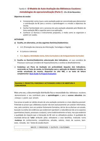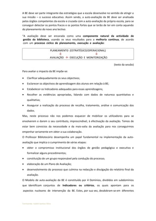 Este documento discute o modelo de autoavaliação para bibliotecas escolares e fornece orientações sobre sua implementação. Ele explica que a autoavaliação deve demonstrar como a biblioteca contribui para o ensino e aprendizagem e objetivos da escola, analisando evidências quantitativas e qualitativas de processos e impactos. Além disso, fornece exemplos de domínios, indicadores, evidências e instrumentos de avaliação para coletar informações comparáveis entre escolas.