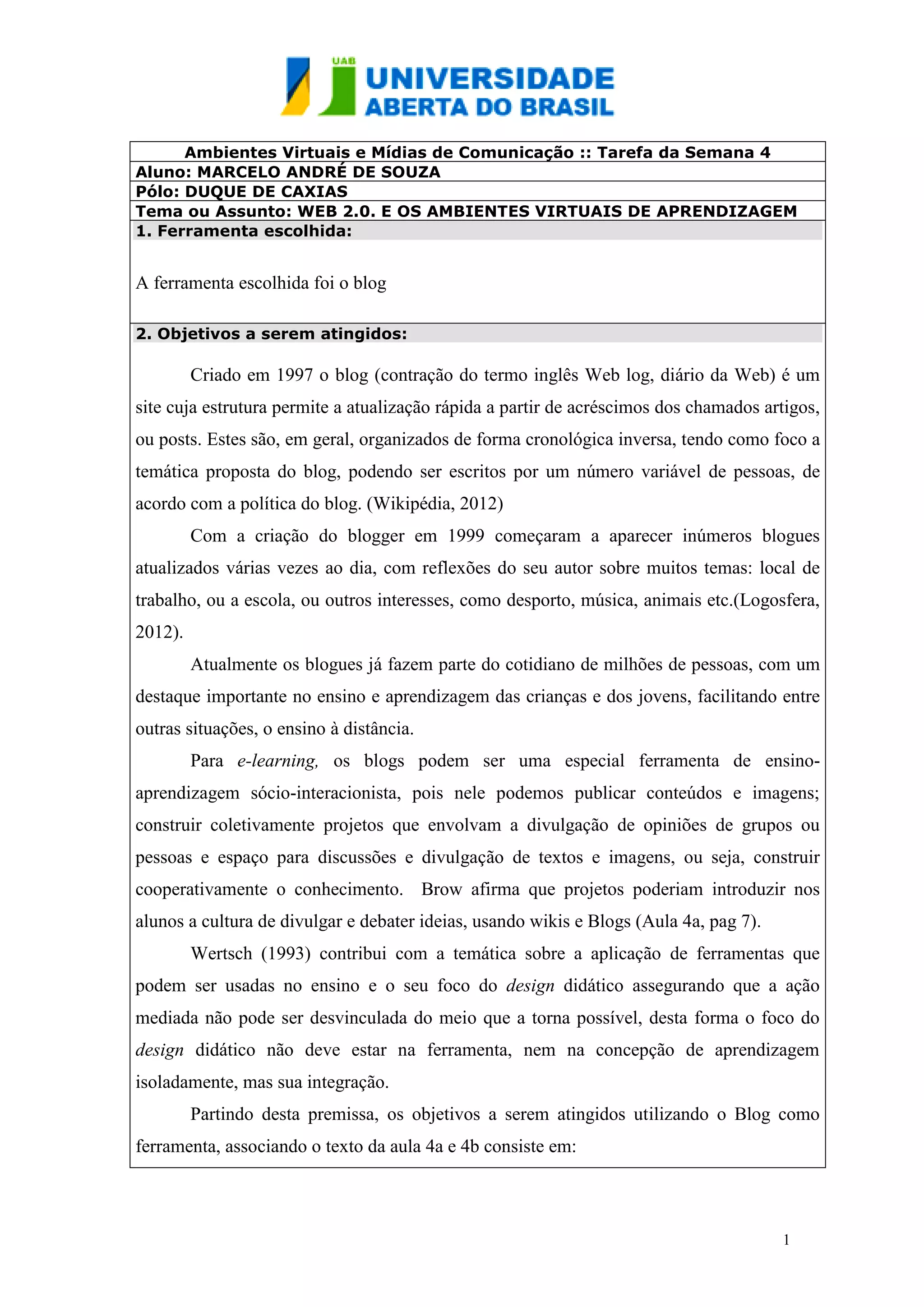 Este documento discute o uso de blogs como ferramenta de aprendizagem virtual. Ele descreve como blogs podem ser usados para publicar conteúdo, permitir discussões e construir projetos colaborativos. O objetivo do blog criado pelo aluno é permitir a discussão crítica de ambientes virtuais de aprendizagem considerando o design didático.