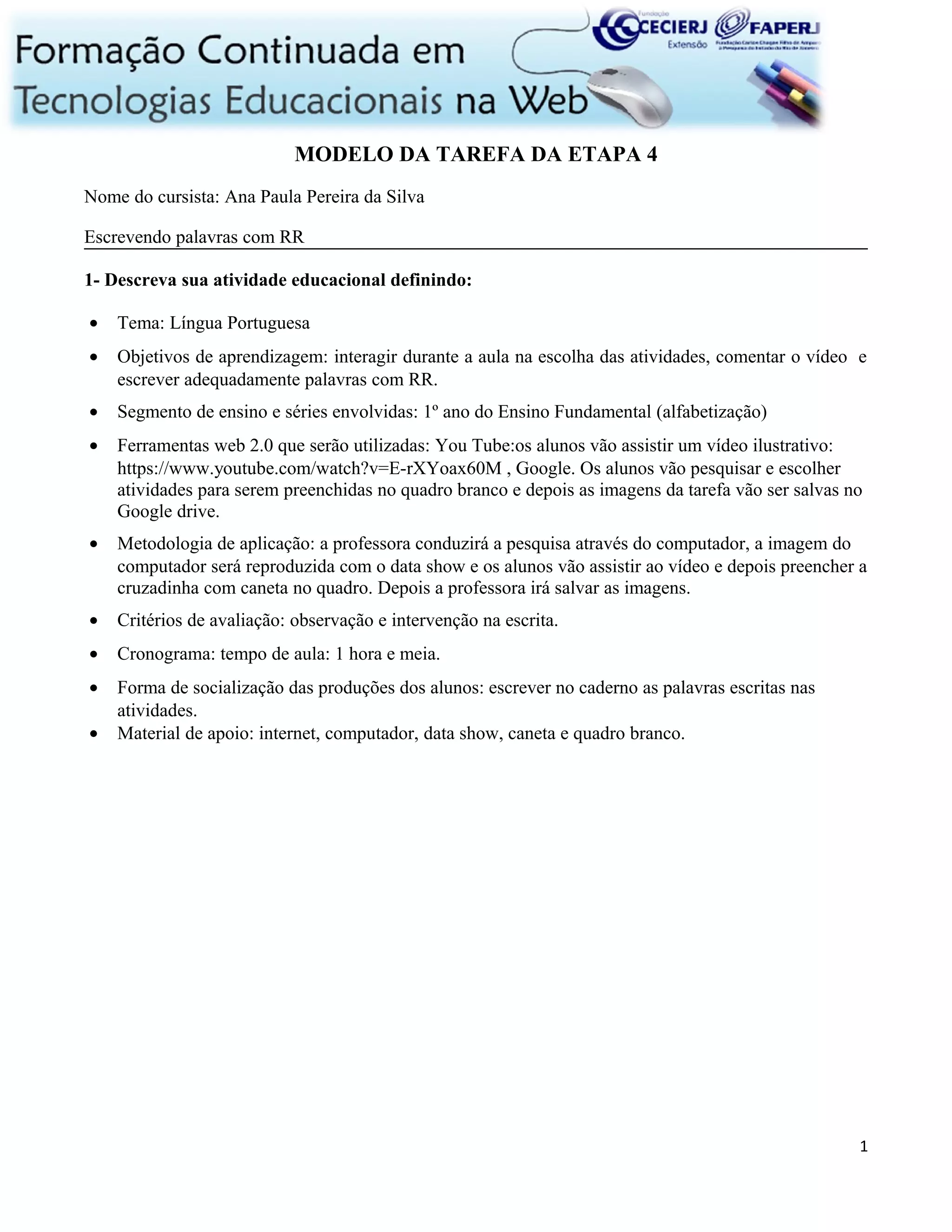 A atividade educacional tem como tema a Língua Portuguesa e objetivos de aprendizagem de interagir durante a aula na escolha das atividades, comentar um vídeo e escrever adequadamente palavras com RR. Ela será aplicada a alunos do 1o ano do Ensino Fundamental utilizando vídeo no YouTube, pesquisa no Google e preenchimento de atividades no quadro branco.