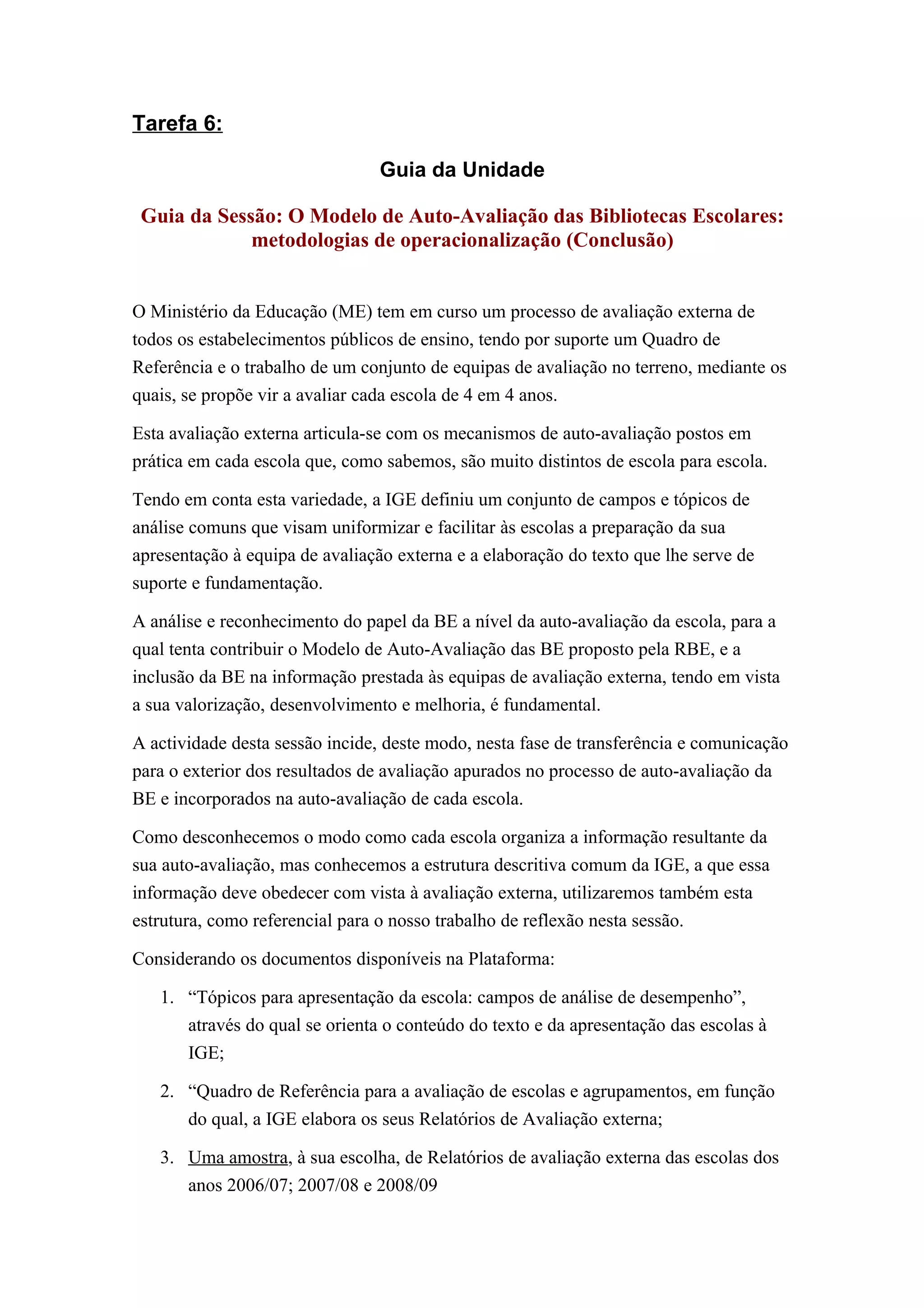 Este documento discute o processo de auto-avaliação de bibliotecas escolares no contexto da avaliação externa de escolas pelo Ministério da Educação em Portugal. Ele fornece uma estrutura comum para organizar informações de auto-avaliação e relacioná-las aos campos e tópicos da avaliação externa. Os participantes são instruídos a criar uma matriz comparando os domínios de auto-avaliação de bibliotecas com os campos da avaliação externa e analisar relatórios de