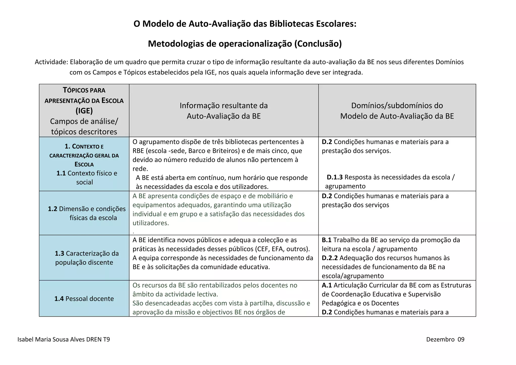 Este documento fornece um quadro para cruzar informações sobre a autoavaliação da biblioteca escolar com os campos e tópicos estabelecidos pela Inspeção Geral da Educação. Ele lista os domínios e subdomínios do Modelo de Autoavaliação da Biblioteca Escolar e como a informação da autoavaliação se relaciona com os tópicos da IGE para a caracterização da escola.